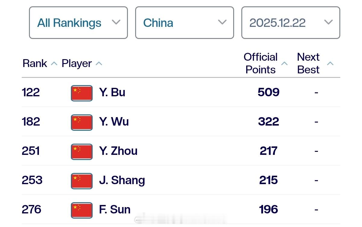 最新一期中国大陆球员ATP单打世界排名TOP300122.布云朝克特182.吴易昺251.周意253.商竣程276.孙发京