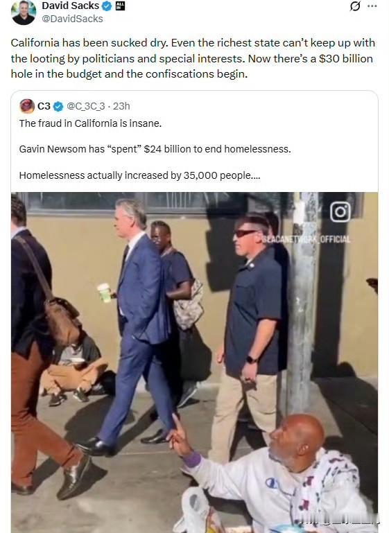 白宫AI和加密货币“沙皇”大卫·萨克斯: “加利福尼亚州已经被掏空。即便是最富裕的州,也无法跟上政客和特殊利益集团的掠夺。 现在,州预算出现了300亿美元的缺口,没收行动也随之开始。”