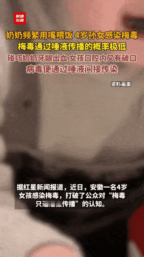 这奶奶罪过有点大了!安徽一4岁小女孩身上总是出现不痛不痒的红疹,起初诊断过敏,孩子用完过敏药后,不见好转反而还加重了! 孩子妈妈赶紧带孩子又去了别的医院检查,这一查把孩子妈妈吓懵了!孩子竟然患上了后天性梅毒! 孩子妈妈跟医生说家里没有这样的传染源呀,孩子近期也没有接触过别人!于是医生就建议全家人都到医院检查一下! 检查结果出来后,传染源竟然是孩子的奶奶!孩子奶奶患有梅毒没治疗过,孩子天天跟奶奶在一起,而且奶奶还经常用嘴给孩子喂饭!导致了病毒的传播! 梅毒经过唾液传播的概率是极低的,由于孩子的奶奶牙龈出血又赶上孩子口腔有溃疡,病毒便传播给了孩子! 4岁的孩子自己吃饭没问题了,这奶奶怎么还可以用嘴喂孩子饭,即便是没有病毒口腔里也含有细菌的,真是太不讲究了!