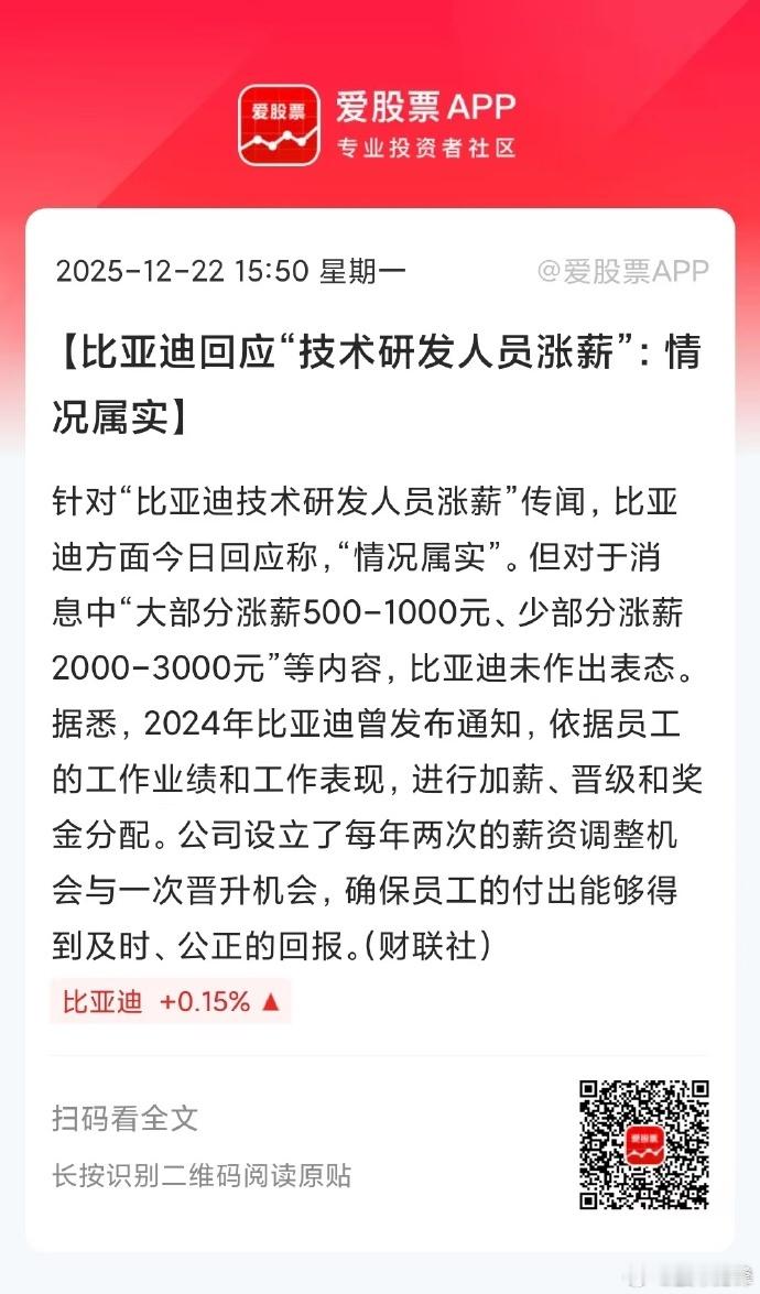 在宁德、字节宣布全员涨薪后,比亚迪也给“技术研发人员涨薪”!迪子有90万员工,技术人员高达11万人,哪怕平均上涨1000元,也是比较大的手笔了。巨头们为什么在这个时候集中宣布涨薪,像约定好了一样:1、顺应中央“居民增收计划”的号召,明星企业带头涨工资,是具有示范效应的。2、新能源汽车、AI等行业竞争激烈,为了吸引人才、留住人才主动加薪。3、为了节税,比如获得高新技术企业所得税15%,其它25%。你不在科技领域多投入,多招技术研发人员,是可能享受不到的。总之,字节、宁德、比亚迪都涨工资了,其它大厂为留住人才,是不是也得行动了?当然,现在涨薪的红利集中于“含科量”较高的人群,普通人不要说涨薪,能保住工资就不错了!不过这是好的开始,就像今年A股的结构性牛市,很多人都没享受到,但至少比熊市强多了!爱股君依然相信全面牛会到来,只不过以轮动的方式实现。我们“全民加工资”也一定会到来,但需要时间。还是那句话,扩大内需消费,最重要就是增加居民收入。居民收入来源主要就两块,一是工资,而是财产性收入。如果未来大家工资能涨一涨,股市能继续牛市(房价止跌),我觉得国内消费是可以起来的!明年消费股机会还是蛮大的。(爱股君)