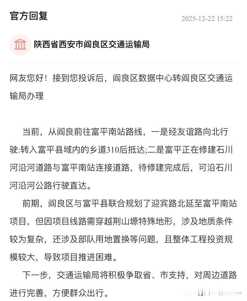 阎良以后怎么去富平南站 阎良以后怎么去富平南站。 富阎快速路 阎良迎宾北路能不能北延伸到富平南站。 官方回复 2025-12-22 15:22 陕西省西安市阎良区交通运输局 网友您好!接到您投诉后,阎良区数据中心转阎良区交通运输局办理 当前,从阎良前往富平南站路线,一是经友谊路向北行驶:转入富平县域内的乡道310后抵达;二是富平正在修建石川河沿河道路与富平南站连接道路,待修建完成后,可沿石川河沿河公路行驶直达。 前期,阎良区与富平县联合规划了迎宾路北延至富平南站项目,但因项目线路需穿越荆山塬特殊地形,涉及地质条件较为复杂,还涉及部队用地置换等问题,且整体工程投资规模较大,导致项目推进困难。 下一步,交通运输局将积极争取省、市支持,对周边道路进行完善,方便群众出行。 感谢您对阎良区交通运输事业的关注与支持。