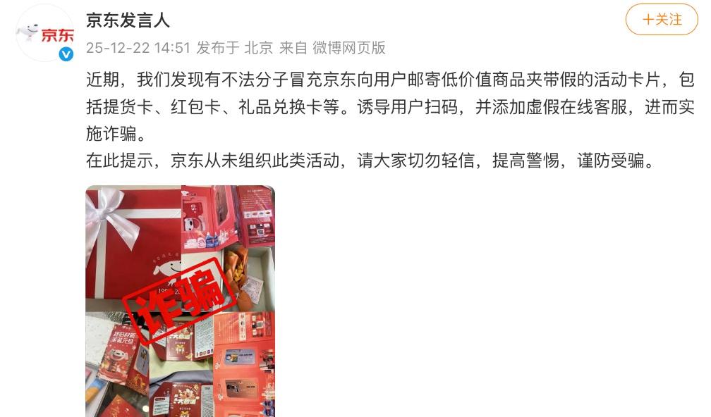 【京东提醒谨防虚假活动卡片诈骗】 12月22日,@京东发言人 发文称,近期发现有不法分子冒充京东向用户邮寄低价值商品夹带假的活动卡片,包括提货卡、红包卡、礼品兑换卡等。诱导用户扫码,并添加虚假在线客服,进而实施诈骗。在此提示,京东从未组织此类活动,请大家切勿轻信,提高警惕,谨防受骗。
