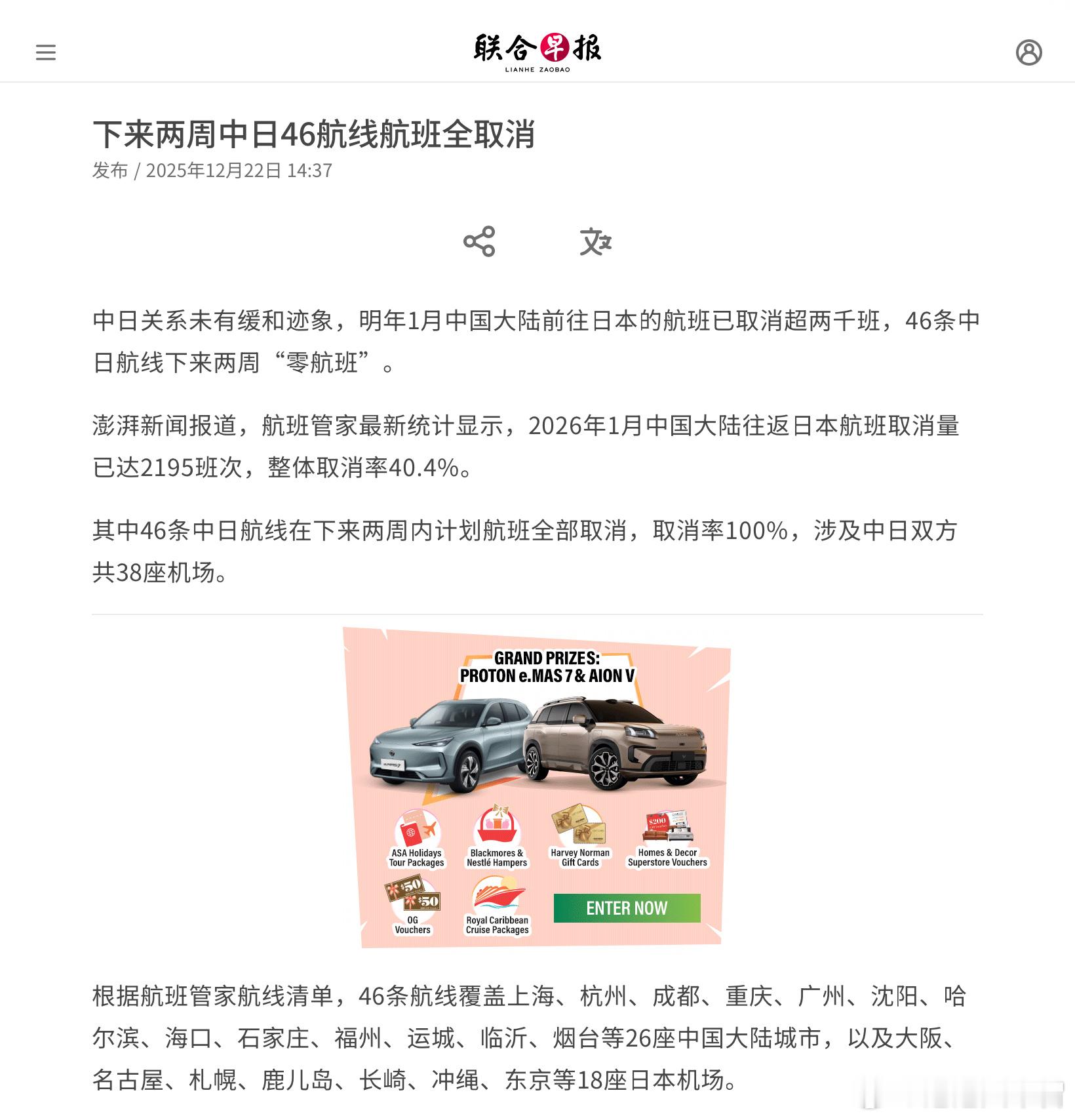 明年1月中国大陆前往日本的航班已取消超两千班,46条中日航线下来两周“零航班”。建议取消全部航线,去日本的必须香港转机,以促进香港经济。海外新鲜事海外新鲜事未来两周46条中日航线取消全部航班