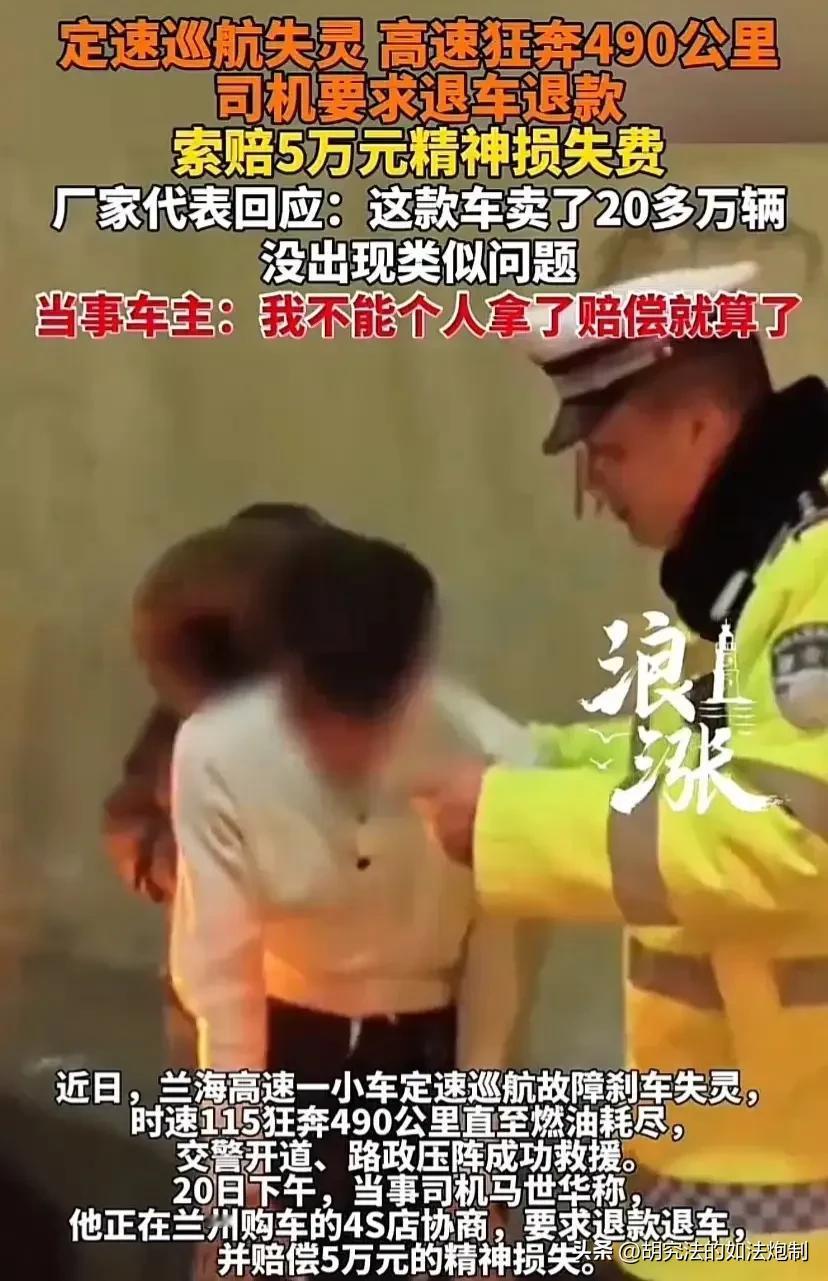 甘肃临夏,男子开车回老家,高速行驶中使用了定速巡航功能。谁知在时速飙到115公里时,男子竟发现刹车失灵了。多亏交警开道,车子一路狂奔490公里后燃油耗尽停车。事后,男子认为买车花了13万,开了还不到两年,出现这种情况是质量问题,遂要求退款退车,并赔偿5万元精神损失费,4S这么回应!(来源:浪涨新闻) 事情的大致是这样的。男子王某在一年多之前花了13万买了一辆车,平时非常的爱惜,车子基本上还像新的一样。 2025年12月17日下午,马某开车准备回一趟老家,车上还载有另一名女性朋友共同前往。 在上了高速之后,马某发现路上的车辆并不多,他想到自己的车有定速巡航功能,又考虑到距离老家还有一段的时间,为了节省体力尽可能的早一点回家,马某使用了定速巡航功能,并把车速固定到115公里每小时。 当车辆行驶了一段路程之后,马某发现路上的车已经越来越多了,出于安全的考虑,马某便准备减速。 结果马某惊恐的发现,自己无论怎么刹车,车速都不见任何下降的趋势。 一番操作未果后,马某认为是自己的刹车失灵了。 无奈之下,王某只能打电话报警寻求帮助。 好在高速交警响应迅速,立刻组织车辆在前方为马某开路,提前对道路进行疏通。 不仅如此,高速交警还打电话安慰马某,一定不能紧张,只要跟在交警的车辆后面即可。 可即便是这样,马某的手心满都是汗,同行的女性朋友更是被吓得惊叫连连。 经过长达几个小时的长途奔波,再连续行驶了490多公里之后,马某的车辆燃油终于耗尽,车速慢慢的降了下来。 当马某从车上下来的时候,只感觉两眼发昏,双腿发软,如果没有交警的开路,但凡马某出现任何一点事故的操作,造成的后果将不堪设想。 自己的车买了还不到两年,平时一直在4s店进行保养,为什么会出现这样的情况? 于是向4s店提出退车退款的要求,并赔偿5万元的精神损失费。 为了消除负面影响,4s店愿意退车退款,不过对于精神损失费的具体数额双方并没有达成一致,4s店仅愿意赔偿2万元,见马某态度坚决,4s店又将赔偿金额提升至为4.5万元。 不过马某认为不合理,坚决要求官方或者第三方权威机构查明事故原因。 那么从法律的角度,该如何看待这件事呢? 《家用汽车产品修理、更换、退货责任规定》第22条规定,在家用汽车产品三包有效期内,符合本规定更换、退货条件的,消费者凭三包凭证、购车发票等由销售者更换、退货。 这里符合退换货条件包括转向系统失效、制动系统失效等。 不过需要注意的是,退换货条件有着严格的时间以及里程的限制,分别为购车发票之日起60日内,或者行驶里程3000公里以内。 可是马某的车已经购买了,接近两年,行驶里程也早已超过3000公里,实际上并不符合退车的条件。 可4s店却愿意给马某退车退款,还赔偿了马某4.5万元的精神赔偿,这是不是从侧面说明车辆存在质量隐患呢? 对此你怎么认为呢?关注@胡究法的如法炮制 多学法律少吃亏。