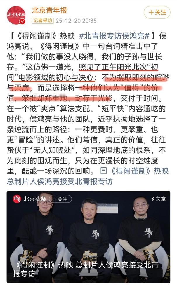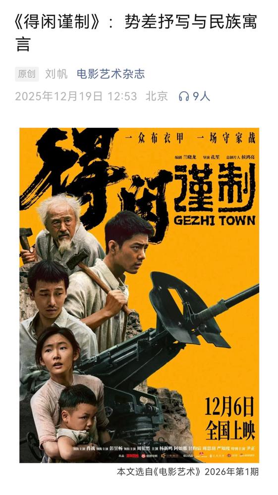 中国文联旗下《电影艺术杂志》2026年1月刊发表有关该电影的学术论文,作者借用物理学“势差”概念创新理论研究并用其对电影进行深度解读。 其实说的就是正午阳光跨界大银幕的首作《得闲谨制》,最近这片子不光在国内学术界火了,连在海外的热度也一直没掉。 我看IMDb上的评分已经稳步涨到了8.5,这个分数在海外电影市场里真的很有分量,说明好故事确实能跨越文化差异。 这片子最戳我的一点,是它完全没有那种流水线商业片的浮躁感,而是被这群人当作一件真正的艺术品在慢慢雕琢。 不得不佩服侯鸿亮、孔笙、兰晓龙这几位老师,这三位圈内公认的“老犟种”找上肖战这个“小犟种”,碰撞出来的火花果然够硬。 我更在意的是这种创作态度,在这个快节奏的时代,他们是真的在为中国电影找出路,而不是单纯做些消耗性的商品。 感觉这波合作就是典型的“双向奔赴”,肖战挑选项目的眼光确实精准,接的几乎全是这种有厚度的高净值项目。 比起那些披着艺术外皮的速食品,这种扎扎实实、带点创新理论研究价值的作品,才叫真的干得漂亮。 这种全员死磕细节的团队聚在一起,不仅电影一炮打响,甚至还给电影艺术的创新立了个标杆。
