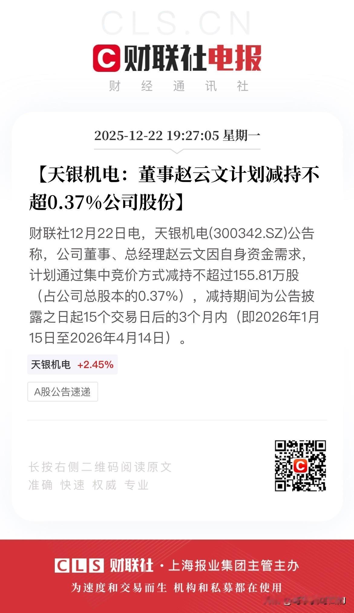 买入第一天就碰上减持,我真的是太背了我! 今天追高5个多点买的天银机电,结果刚买进就开始跳水,然后日内就再也没有回到这个点位,我真的感觉就是被监控了一样! 白天追高亏了3个多点也就罢了,没想到晚上还要追着我锤,高管居然跳出来要减持155万股! 虽然减持比例不大,但是感觉现在商业航天已经有点开始分歧了,而且天银现在也在高位了,明天情绪一发酵搞不好就要大幅低开! 哎,真的是太难了!