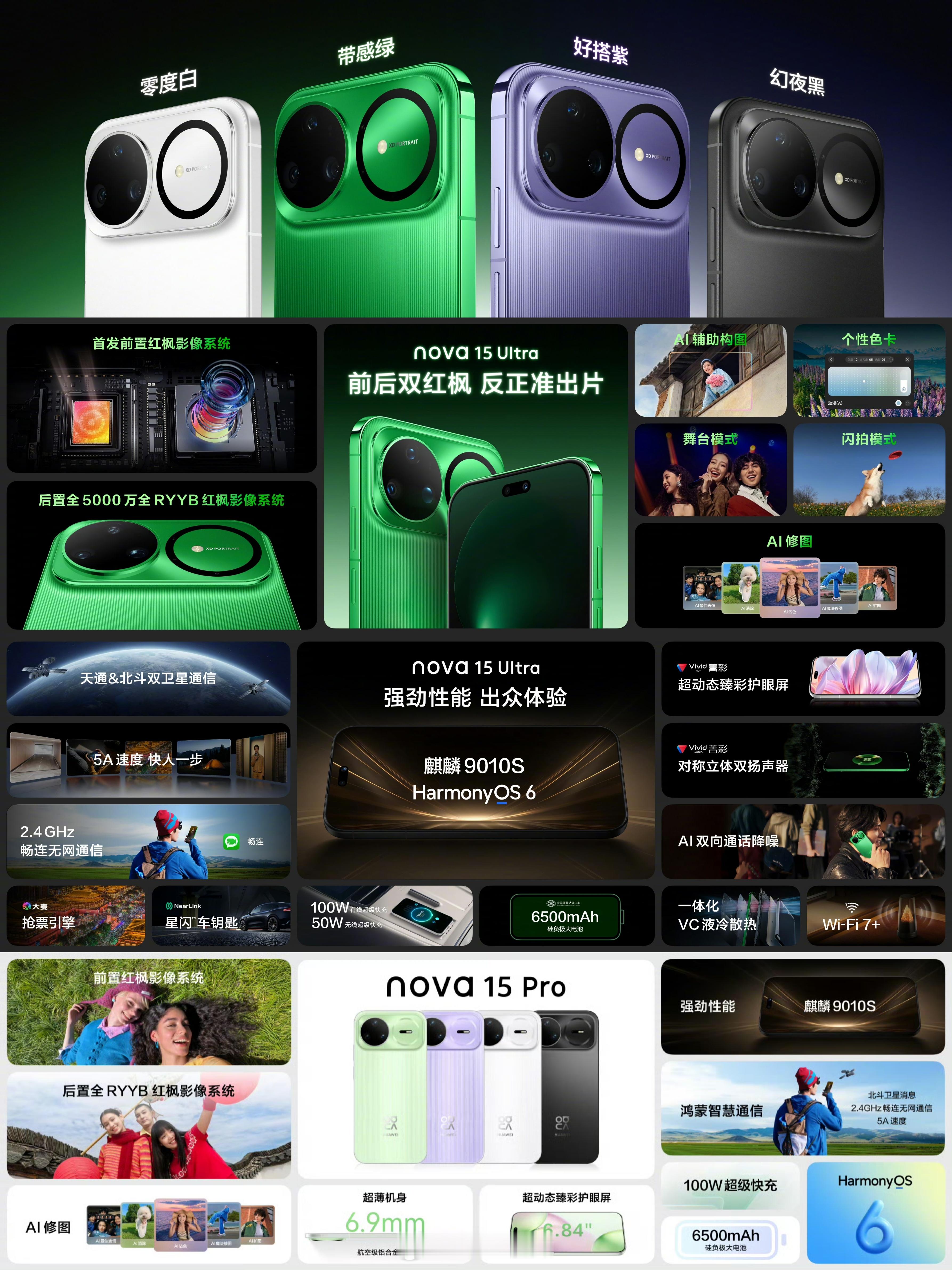 这次nova系列真的把诚意拉满了!全系标配红枫影像、100W快充和北斗通信,配置一点不缩水。nova 15 Ultra和Pro的前后置红枫影像体验一致,不管自拍还是拍景都能出片,前置5000W主摄更是精准戳中爱拍照人群的需求。产品力全面回归,这个配置组合真的太有竞争力了!