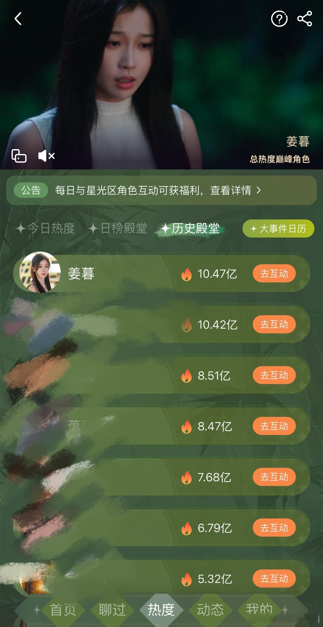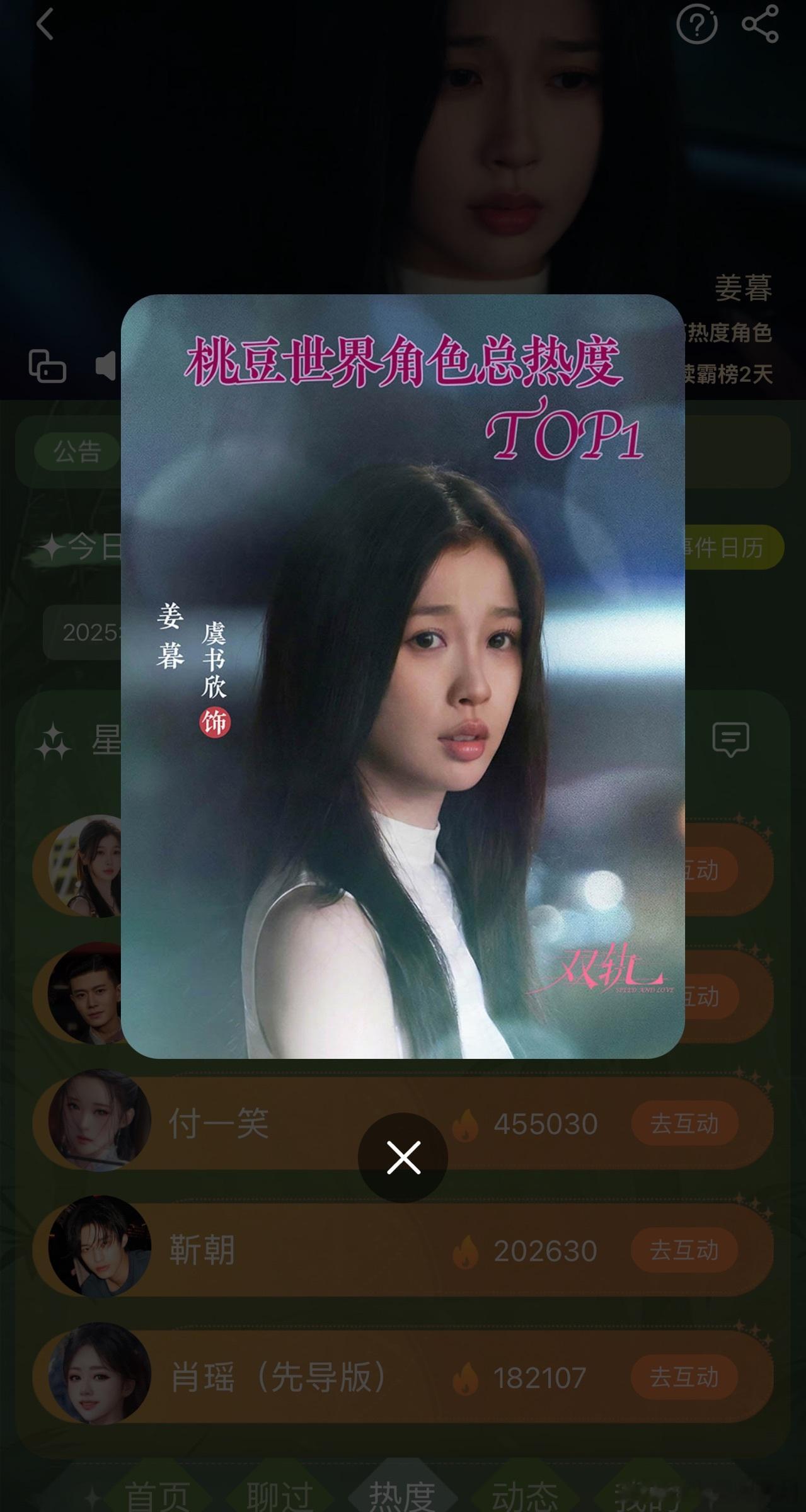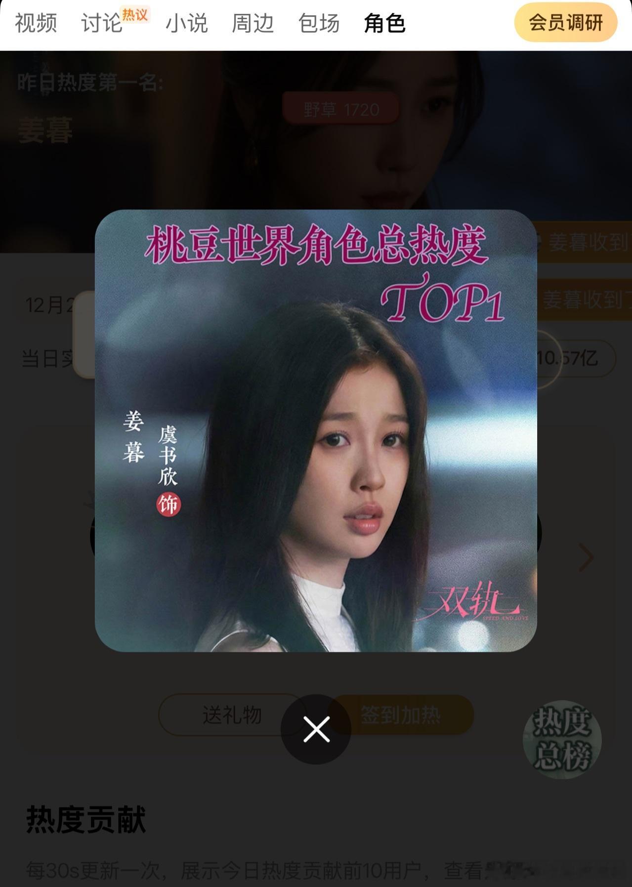 虞书欣姜暮角色热度 虞书欣和小石榴真的太牛了,空降播出第九天爱奇艺站内角色榜姜暮集已经是TOP1了,角色榜前五有且只有这么一个女性角色,也是唯二破10亿热度值的角色。