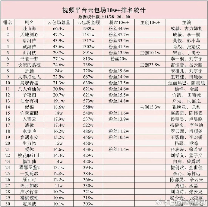 成毅包揽云包场前三 截止12.22,《长安二十四计》云包场已经51.1万场,创优酷历史云包场第一名,也是全平台第二名。目前全平台第一名是赴山海,第三名是天地剑心,全平台前三名全是成毅,一人创三平台史冠,四个月连续播三部剧达成,成毅商业价值和号召力max!成毅三平台云包场史冠