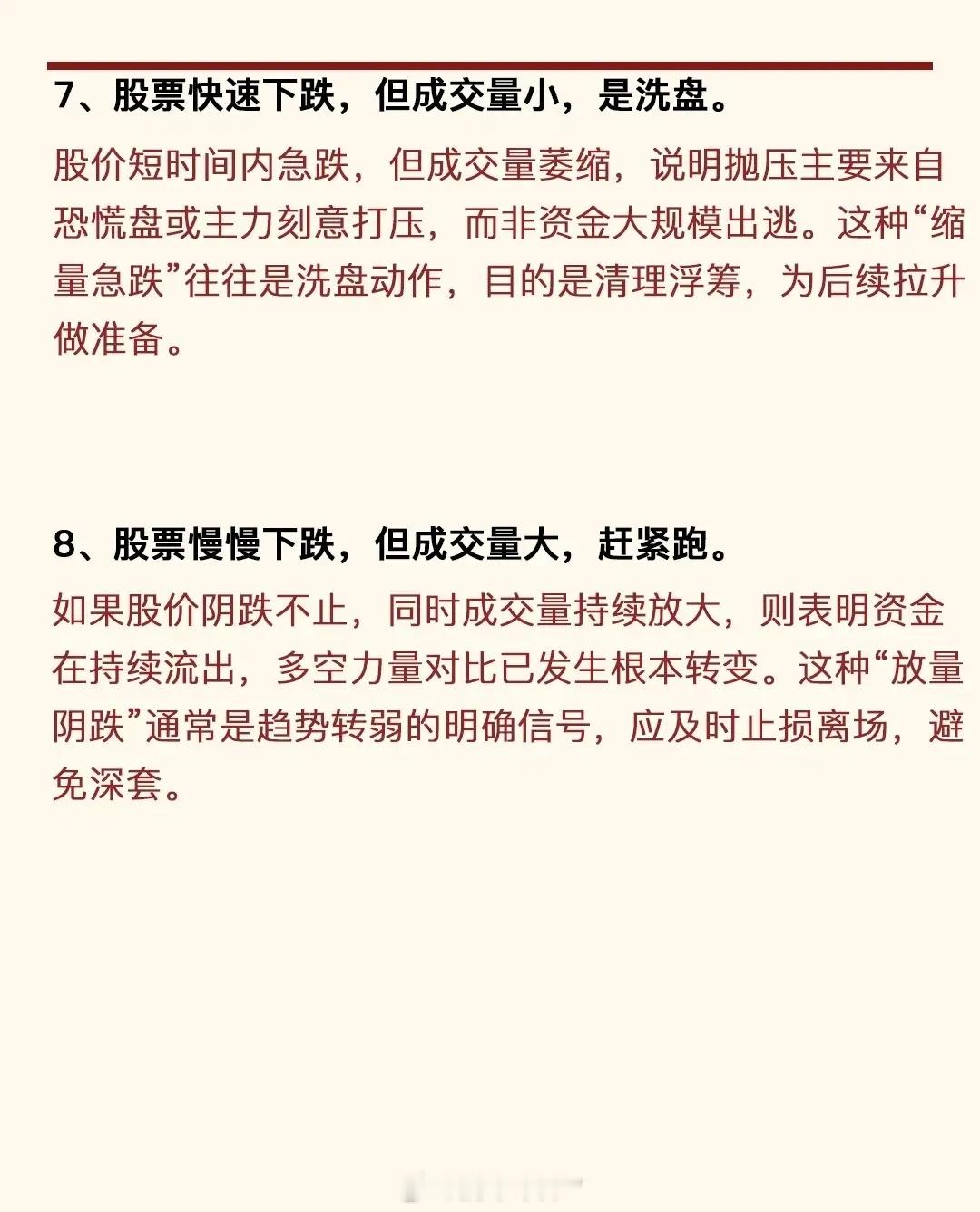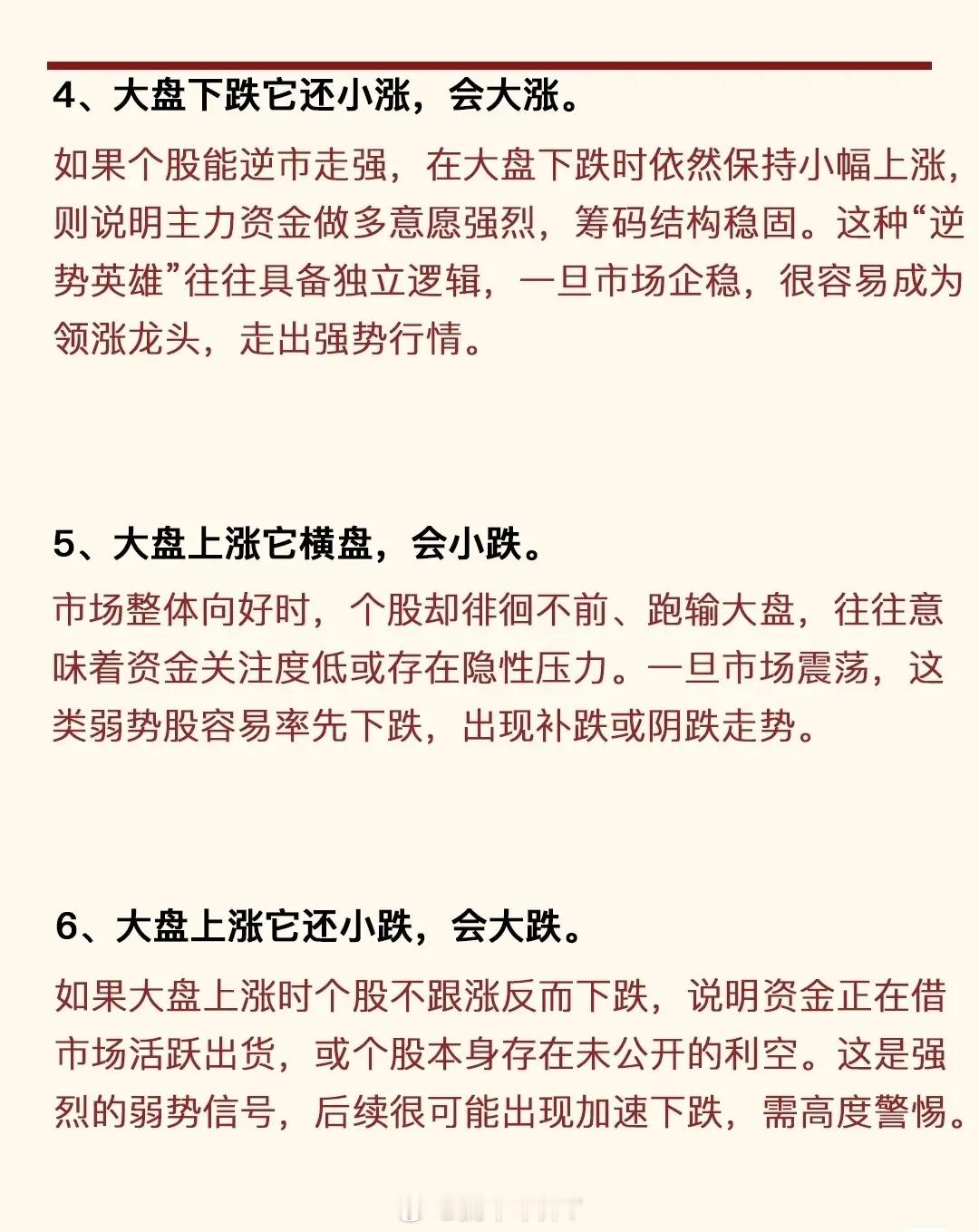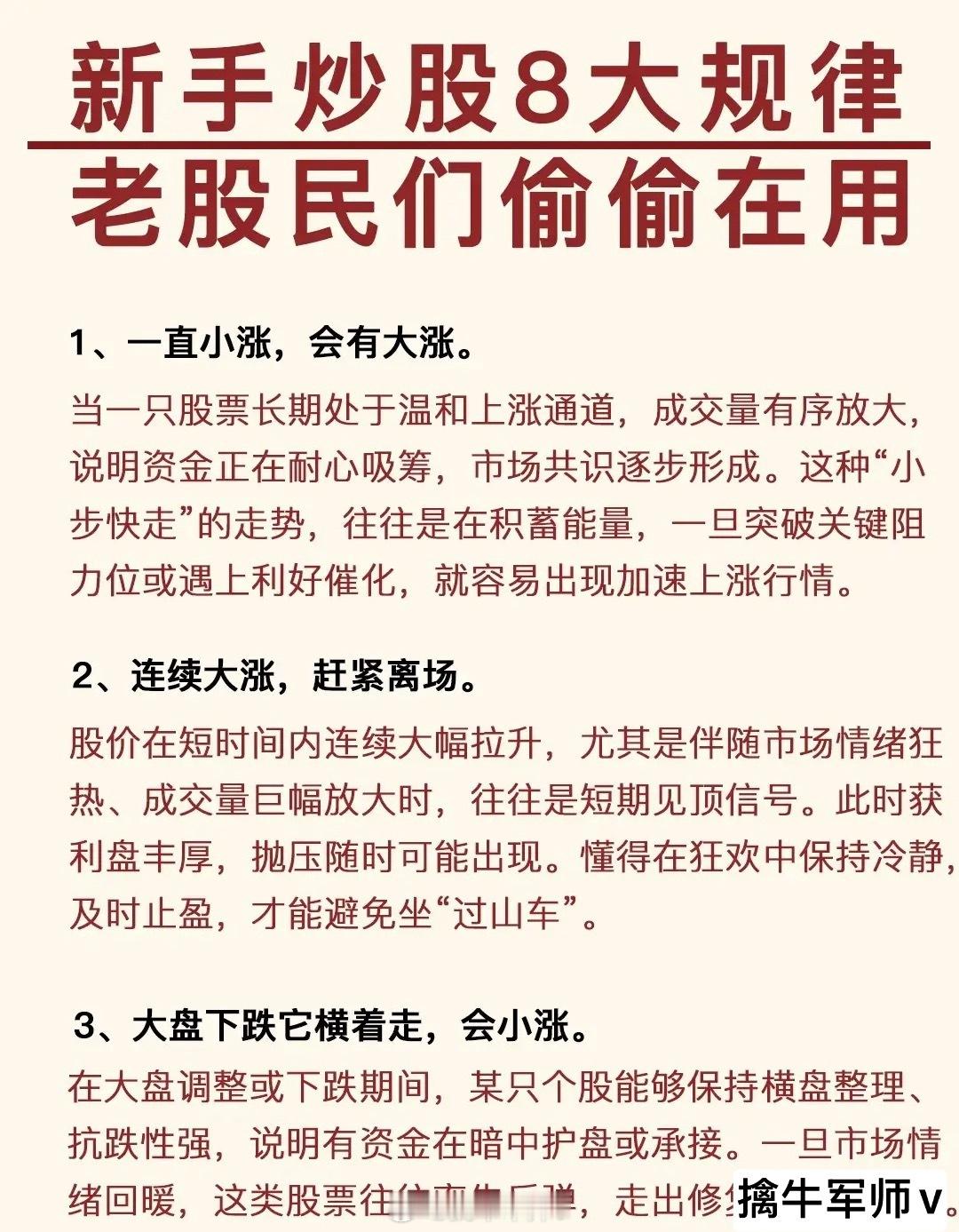 炒股8大规律,核心如下:1. 一直小涨(量有序放大)→ 积蓄能量,易大涨;2. 连续大涨(情绪狂热)→ 短期见顶,需离场;3. 大盘跌它横盘→ 抗跌有资金承接,回暖易小涨;4. 大盘跌它小涨→ 主力做多意愿强,易大涨;5. 大盘涨它横盘→ 资金关注低/有隐压,易小跌;6. 大盘涨它小跌→ 借势出货/有利空,易大跌;7. 快速下跌但量小→ 缩量急跌是洗盘(清浮筹);8. 慢慢下跌但量大→ 放量阴跌是转弱信号,赶紧跑。