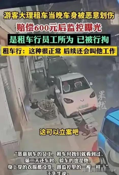 云南大理,男子和朋友出去旅游,为了出行方便租了一辆新能源轿车,每天租金为30元。租赁期间男子始终小心驾驶,可到期归还时,验车员却告诉男子,右保险杠有明显的划痕,要求男子赔偿1000元。男子感觉不可思议,不过还是赔偿了对方600块钱。事后男子无意中发现停车点对面有监控,在查看监控后,男子果断报了警。(来源:法治在路上) 事情的大致是这样的,男子王某和好朋友孙某相约来到云南大理旅游。为了在旅游期间出行方便一些,王某和孙某商量通过线上一家租车公司,租了一辆新能源轿车。 双方约定每天的租金为30元,如果车辆发生刮蹭等情况,王某作为过错方应该承担维修赔偿责任。 为了避免不必要的麻烦,在日常出行的时候,无论是王某还是孙某,都小心翼翼的驾驶,生怕把车给碰了。 每次使用完车之后,王某也会把车停在停车位上。 在租了两天之后王某联系租车平台归还车辆,随时验车员对车辆进行验收时发现车辆的右保险杠有一处明显的划痕。 而且这个划痕是新划痕,根据双方签订的租赁合同,王某需要赔偿给对方1000元。 王某和孙某感到有些不可思议,自己开车的时候都非常的小心,怎么还会有划痕呢? 可是面对这么一出新的划痕,两个人却又找不出来证据,只能自认倒霉。 经过一番讨价还价之后,王某赔偿给对方600块钱。 可事后王某越想越觉得奇怪,如果在开车过程当中刮擦了王某不可能不知道,那么问题只能出在停车期间。 他围着停车的地方转了几圈后,却意外发现在停车位的对面竟然有一个监控。 由于王某个人无权调取监控,无奈之下王某只能选择报警。在民警的协调之下,王某终于查看到了监控,根据监控录像显示当晚 23时许,一名戴着口罩帽子把自己捂得严严实实的男子出现在监控画面里。 这名男子先是确认了车牌号之后便从兜里掏出了什么东西,对着车辆的右保险杠便开始刮了起来,做完这些之后男子逃离现场。 随后民警展开调查,事情的真相也很快水落石出,原来划车的那名男子正是租车行的一名员工,他们为了骗取赔偿,故意自导自演了这一场戏。 真想出来之后租车行,立即联系到了王某,愿意退还600元的赔偿金,不过作为条件,王某不得以任何理由,通过任何渠道再追究他们的责任。 遭到王某的拒绝之后,租车行又表示,刮车的虽然是租车行的员工,不过是个人行为,与公司无关。 那么从法律的角度,该如何看待这件事呢? 《治安管理处罚法》第49条规定,盗窃、诈骗、哄抢、抢夺、敲诈勒索或者故意损毁公私财物的,处5日以上10日以下拘留,可以并处500元以下罚款。 租车行以非法获利为目的,通过虚构事实掩盖真相等途径,从王某身上获得600元的赔偿金,虽然数额并不多,其行为已经违反了上述法律条款。 最后那名员工被行政拘留12天并罚款800元。 对此你怎么认为呢?关注@胡究法的如法炮制 多学法律少吃亏。