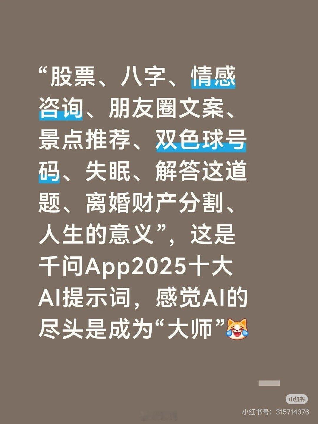 千问App发布2025十大AI提示词股票双色球入选2025AI十大提示词千问2025年AI十大提示词榜单里看到“景点推荐”上榜我可太有发言权了,出门旅行前问问AI能省不少心,而且还能快速给出建议,随便追问,贼好用!