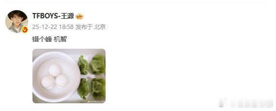 王源错峰过冬至 昨天冬至,刚刚发博“错个锋 机智”并发布一张饺子和汤圆的照片,很有过冬天的仪式感啦,你昨天吃饺子还是吃汤圆了呢~