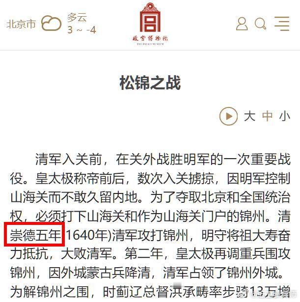 故宫博物院官网将“松锦之战”称为“松锦大捷”后续:“松锦大捷”有人投诉,现在已经改成了“松锦之战”。至于把1640年清崇德五年,我认为不妥。这清军还没入关,就用清的年号?不写个崇祯十三年?我认为应该继续投诉。你让某些大V日拱一卒的后果,那就是现在跳得太高。