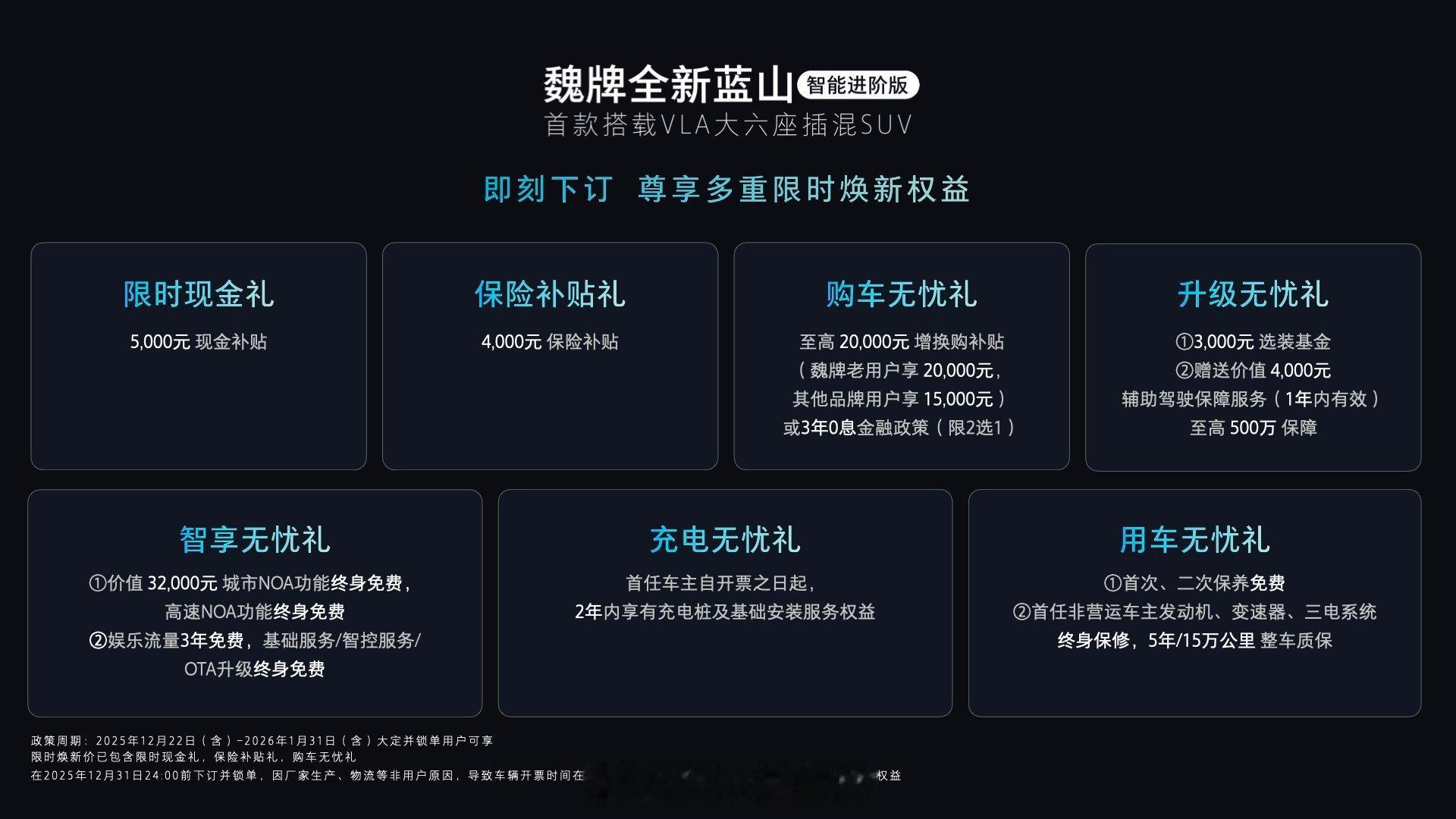 魏牌全新蓝山智能进阶版价格来了!限时焕新价:四驱Ultra黑武士版30.28万元四驱Max+版28.78万元四驱Max版27.58万元截止到12月31日前还享受跨年购置税补贴权益这台三十万元级的家用SUV大家觉得怎么样~长城汽车VLA首搭魏牌蓝山魏牌蓝山