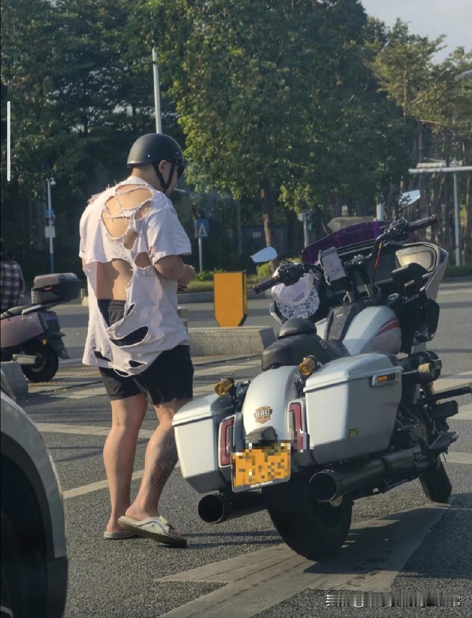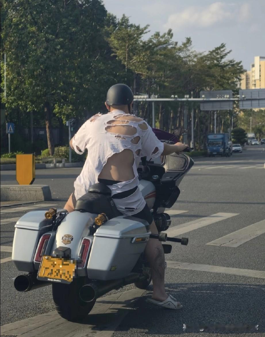 骑百万摩托却穿“破烂衣”,这穿搭我是真看不懂! 在路边拍到这一幕,直接刷新了我对机车圈穿搭的认知🤨大哥骑着看着就价值不菲的重型摩托,头盔配得板正,结果身上的白T恤破得跟筛子似的,后背几乎全露出来,脚上还趿拉着一双拖鞋,混搭得离谱。 有人调侃“看不懂的穿搭一律算巴黎世家”,这话还真没毛病!明明能骑得起昂贵的重机,却连件完整的衣服都不穿,不知道的还以为是故意搞的潮流设计。有人说这是大佬的随性,有钱了就不在乎外在;也有人觉得是打肿脸充胖子,车是撑场面的,衣服才是真实生活。 你们觉得,这种反差穿搭到底是真随性还是假精致