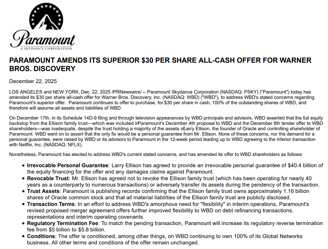 在周一发布的公告中,派拉蒙天舞宣布修改此前的收购要约,核心变化是加入拉里·埃里森的个人担保。