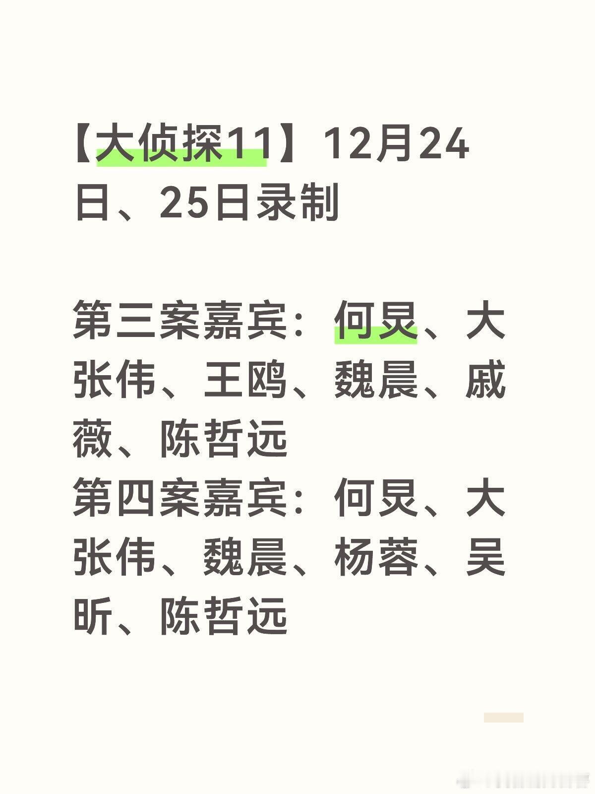 【大侦探11】第3、4案来了!【大侦探11】12月24日、25日录制第三案嘉宾:何炅、大张伟、王鸥、魏晨、戚薇、陈哲远第四案嘉宾:何炅、大张伟、魏晨、杨蓉、吴昕、陈哲远 大侦探|