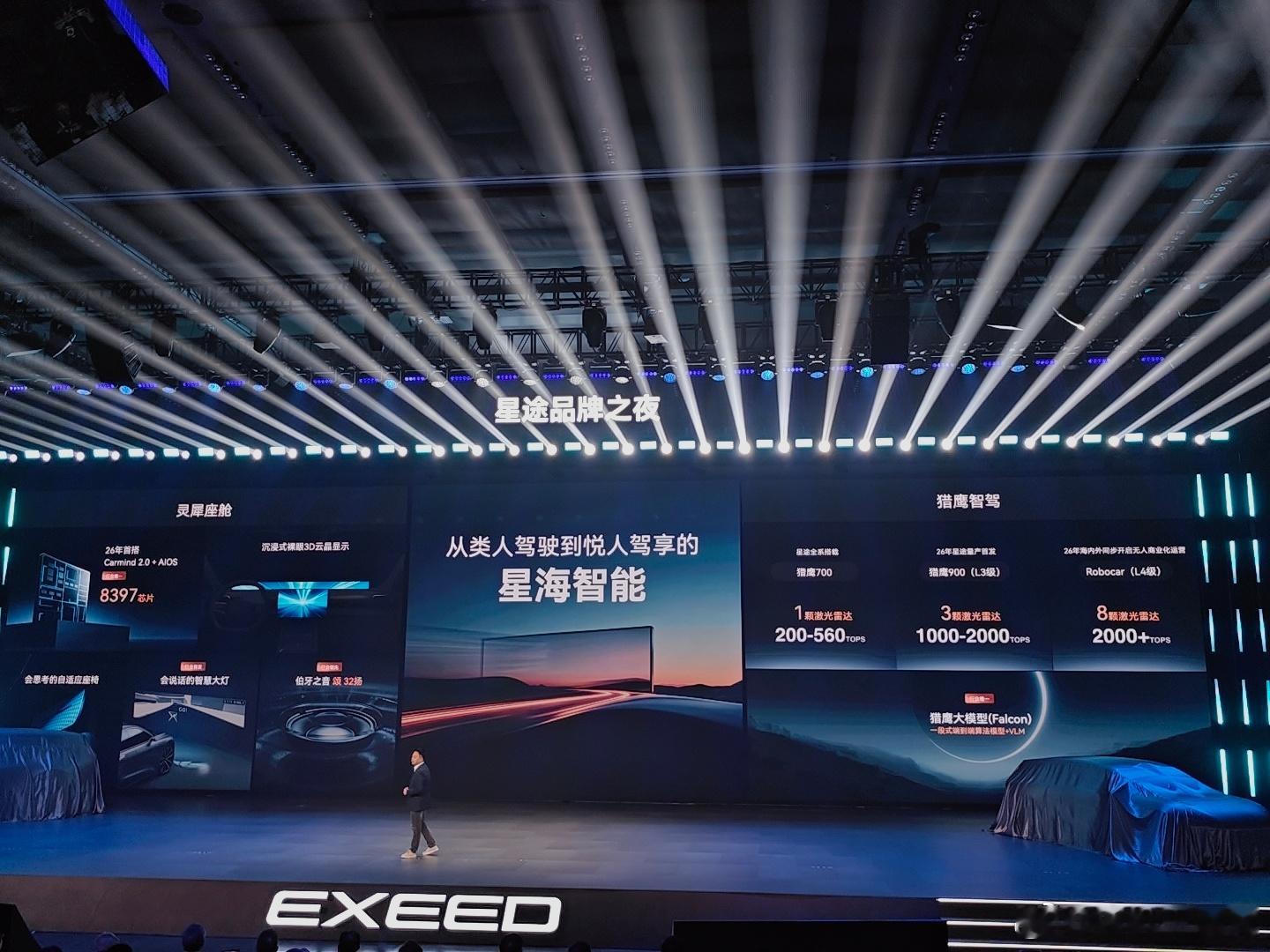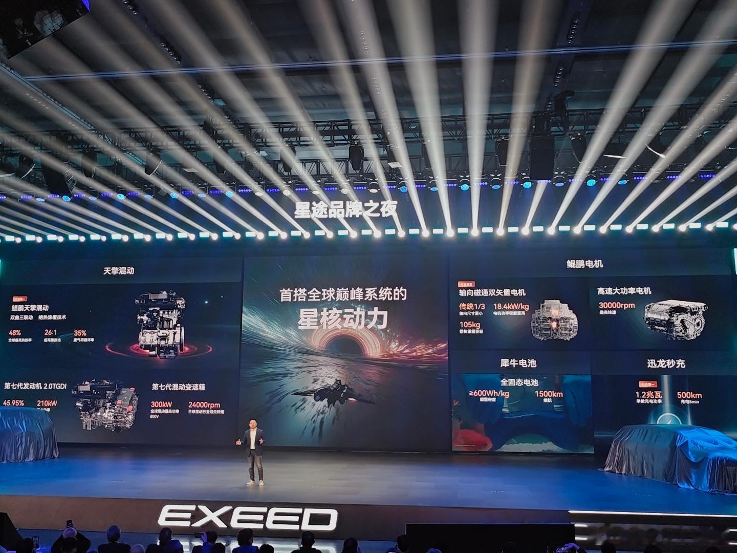 来2025星途品牌之夜了,今晚亮相了4台新车:ES7 GT、ES8、ET8和ET9。星途ES8定义为「One-Box星际猎装」,532的车身尺寸,风阻系数0.22Cd,星空漫反射设计的前后灯组,采用双矢量电机,配备了后轮转向、六活塞卡钳和磁流变悬挂,会搭载固态电池,综合续航超过1000km,2026年上市。星途ET9是旗舰级大六座SUV,甚至说有对开门、天地门、旋转座椅、原地调头、后轮转向和主动液压悬挂等等。星途ES7 GT的话,有混动和纯电双版本,综合续航1700km,基于1000V平台,5分钟可以补能450km,零百只需3秒。星途ET8是大六座SUV,加入了真木、真铝等材质,还有星河贯穿百万像素大灯、星轨天幕啥的,二排带机械按摩。这下子星途属于轿跑、猎装、SUV都有了,说是未来10~20个月将完成3款以上的新车发布,全系搭载猎鹰700辅助驾驶,2026年量产首发猎鹰900(L3级、3颗激光雷达)。来啦,这4台车里面,你们对哪台感兴趣?