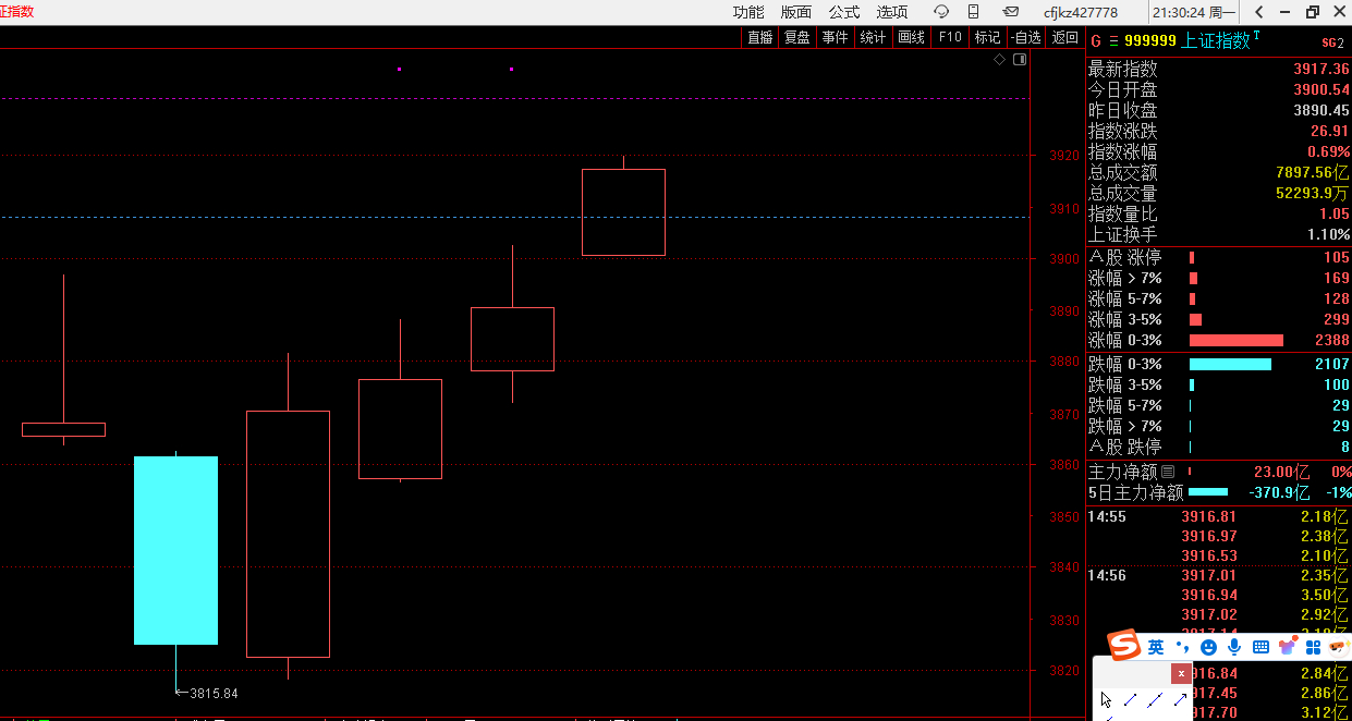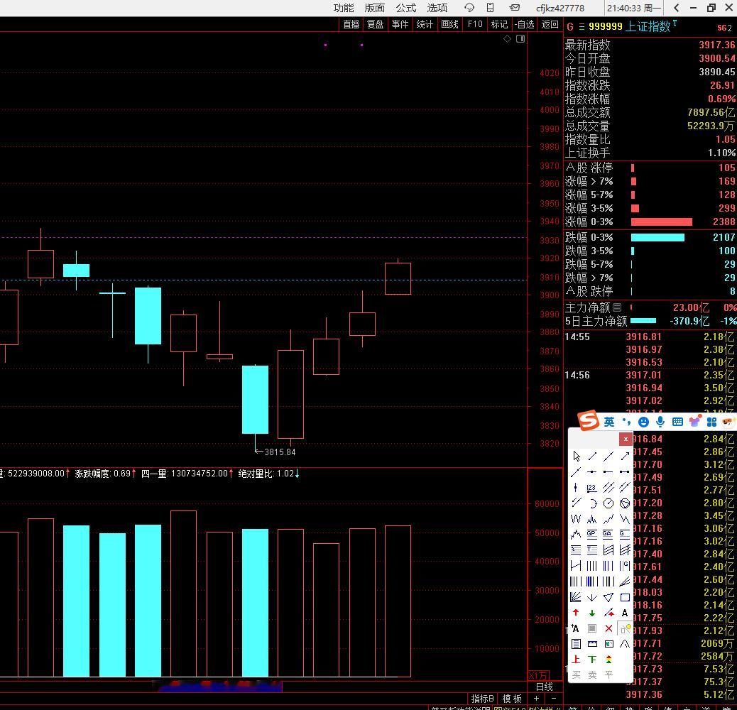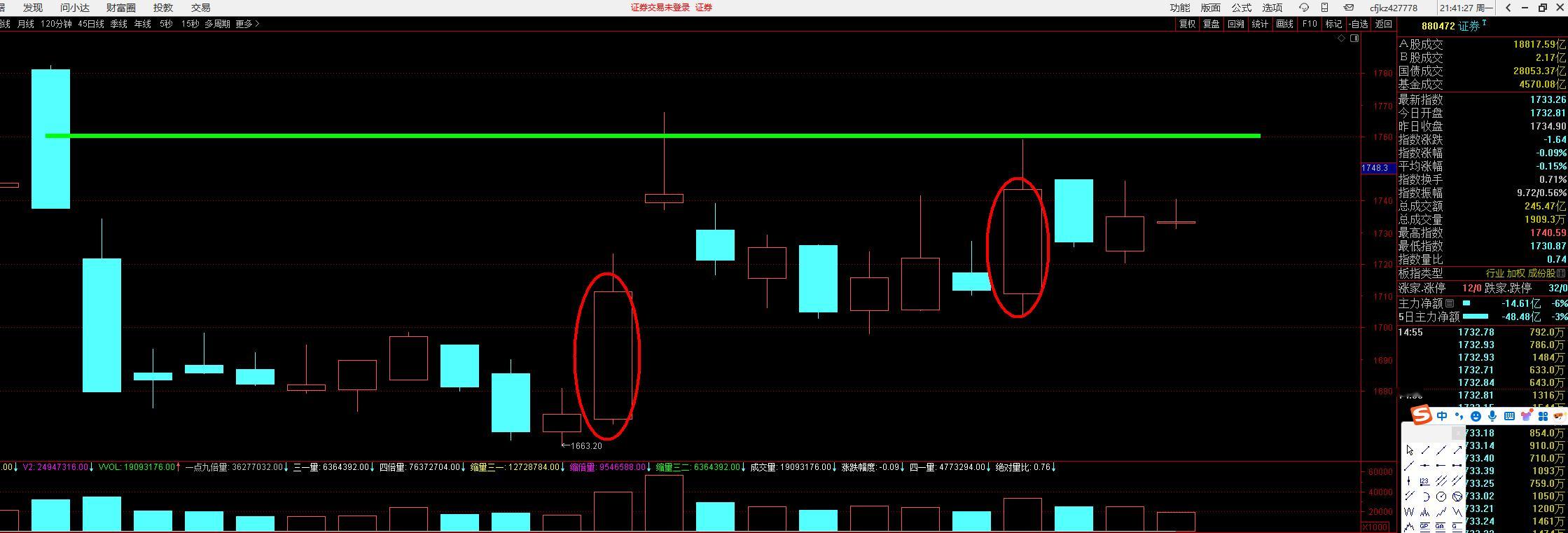 变盘点附近做复盘1、用期指的角度去看,今天收了一个假阳(图1),从量性去看,今天确认了上周三的阳线是一个将军柱换挡,左侧先是黄金柱刹车,这里退化成了将军柱换挡,如果明天不能往上再次走强去改变量性,就以防为主了,此外贪恐指数今天是64,理论上,没有证券走强参与的位置,存量资金做快速轮动,贪恐指数到了75上下,形态不走强,随时会出现回调,因此明天注意开盘定势,一旦走弱,对整个市场的杀伤力就体现出来了。2、还是只看今天这个价柱,看实体、看阴阳、看上影线,都比今天的上证指数要差,你对比去看,(图2是今天期指的日象、图3是今天上证的日象)1)期指是低开、上证是跳空高开,不同步,且期指弱2)期指是假阳未超过昨日收盘,上证是真阳,不同步,期指明显弱3)期指有冲高回落的小上影线,上证的上影线几乎忽略不计,这也是期指弱的细节4)看分时,期指尾盘跌破分时人线(均价线),上证全天在分时人线(均价线)之上,也体现了期指的弱。既然是弱,你就做好准备,主力如果明天开盘再次走弱,你就以我给的上证指数下线为防守,不管是止盈还是保本,还是少亏,都不能让自己后面被动了。3、上证指数今天收梯量柱(图4),常态看跌,变态看涨,既然常态容易跌,那么明天也需要做防守。4、证券指数也是黄金柱刹车+将军柱换挡,今天是假阳十字星(图5),比上证和期指都要弱,是弱上加弱,也提示我们要防守。5、最后东方财富,作为券商最重要的权重股,今天也是一个隐性的不成功的将军柱(图6)今天收盘23.08,左侧周三的基柱收盘是23.09,你看是不是差1分钱,但是注意了,东方财富价柱的实体是不是比证券价柱的实体要强?那么这种又容易在次日演化成权重托市去震荡,但这种震荡,于交易是很不友好的。6、我想表达什么?1)明天要有防守的思想。2)就算明天不直接锤人,你也别大意,就算继续震荡维持着,你也需要知道主力随时准备害人,还是要有防的准备。3)对自己不友好的市场,换了我就不参与了,耐心等后面市场会给每个人最适合他自己的那个交易机会出现,但不能吃亏,尤其不能吃大亏,否则后面什么都别谈了。