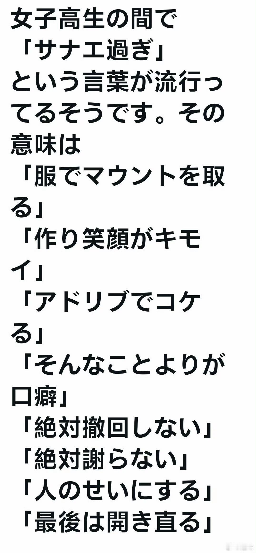 日本女高中生最新流行语“太早苗了”,这句话一般这样用: 穿什么衣服最重要(来自高市参加G20因为穿衣迟到); 假笑过分得让人吐(没想到日本人也这么评价她的假笑); 顺嘴胡说(或者说被别人逼急了说的,自己不想这样说); 绝对不撤回(死鸭子嘴硬); 绝对不道歉(我们不稀罕她道歉,她应该把吐在地上的口水舔回去); 总觉得是别人的错(不认错没关系,撞到南墙别哭)……