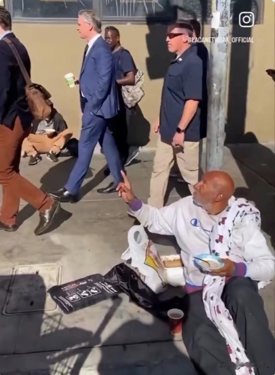 共存了,加州州长单手插兜路过“斩杀线” 美国社交媒体一张图突然登上了中国得热搜,美国加州州长纽森单手插兜,手拿咖啡从流浪汉环绕的街头走过,而地上坐着的流浪汉们就是这几天的热词“斩杀线”。 一面是高高在上西装革履的州长,而地上坐着的他的市民,手里端着一碗稀粥和不知道哪个夜晚就要失去生命的未来。
