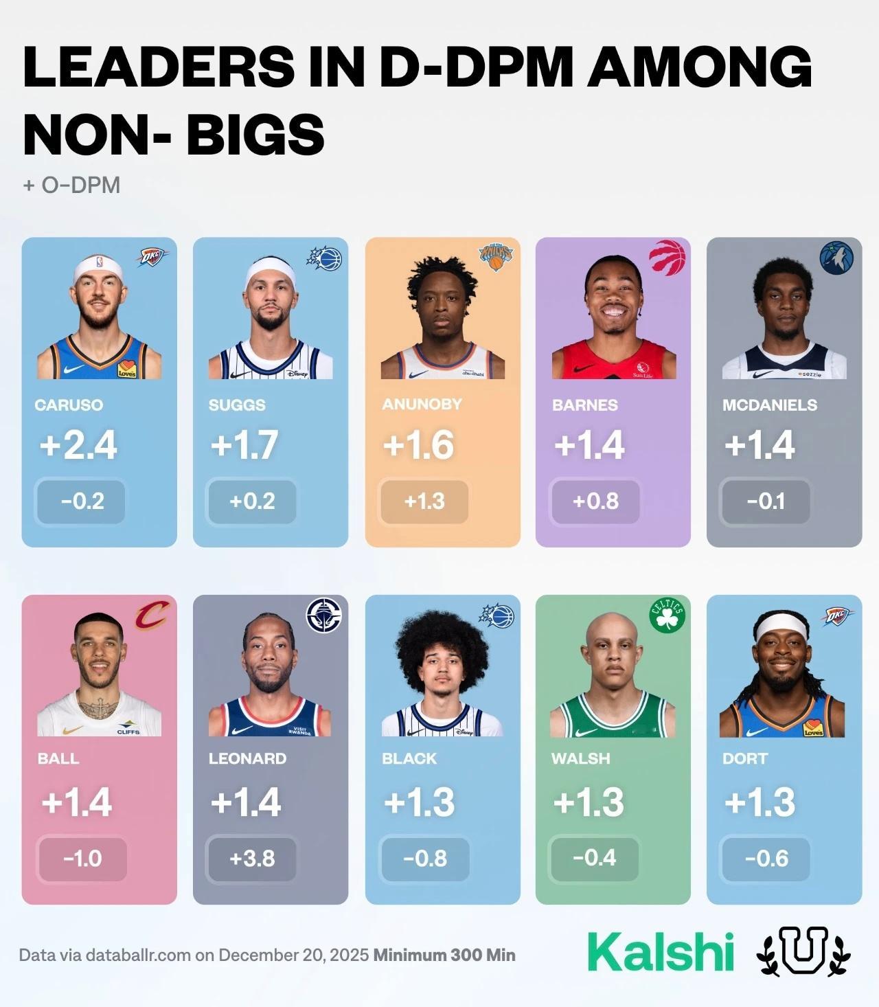 本赛季非内线防守影响力D-DPM榜单,卡鲁索+2.4领跑,但是他的进攻则是-0.2,多尔特+1.3也有上榜,但是进攻削弱更多了。编辑by蓝色狂潮OKC灰熊vs雷霆2026nba全明星投票雷霆