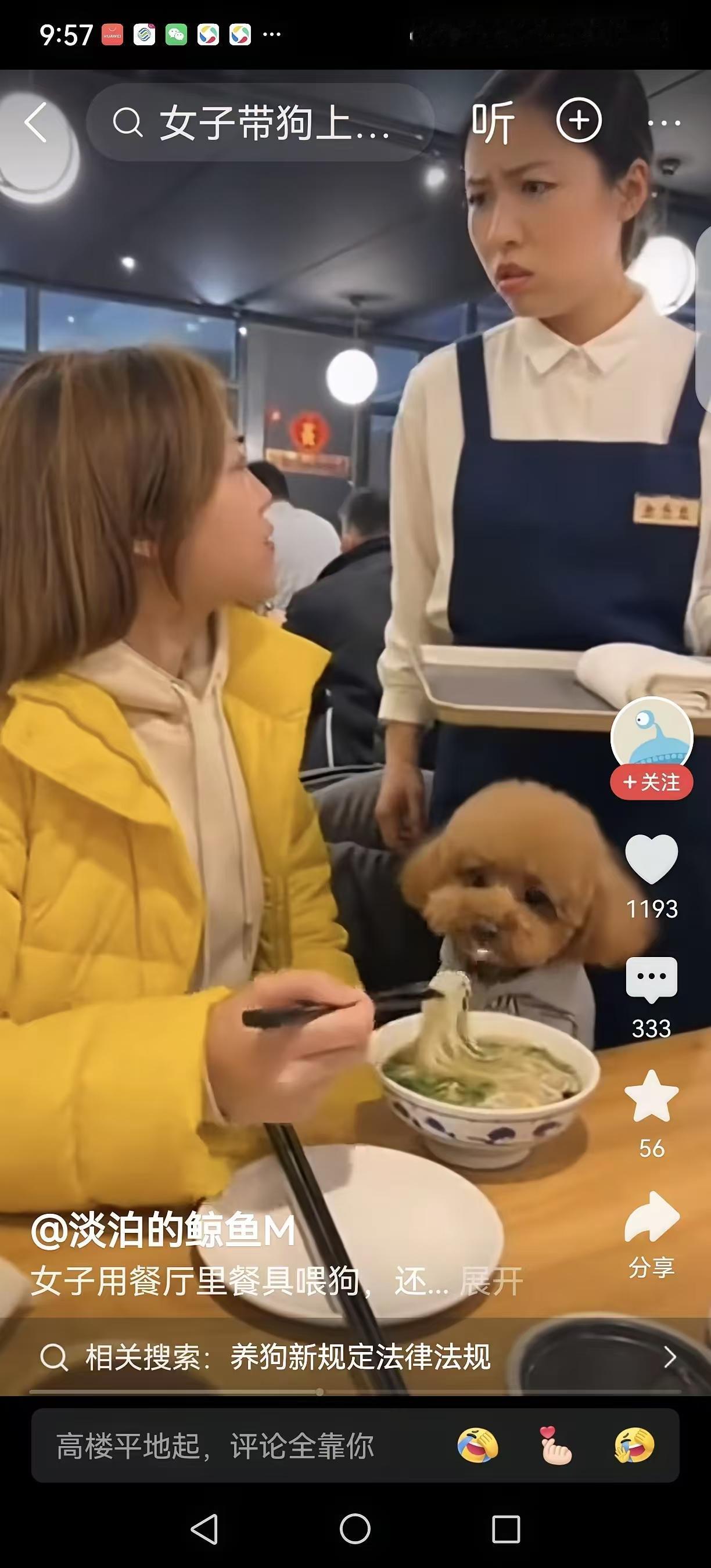 一位女顾客在餐厅里吃面,顺便也喂起了她的宠物狗。可以喂,但是不能用饭店得餐具,饭店也可以提供一次性的宠物餐具,你看看飞机和高铁都可以带狗狗坐了,这也是一个商机。 发现让狗进入餐厅的,饭店不制止,食客马上走人拒绝买单,全民行动起来,支持该意见的,点赞。 饭店不让狗进去,狗主人怎么喂狗?老板不该让宠物进店,顾客不该拿人用的餐具喂狗,都该处罚。 狗本来就不能进公共场所,饭店让狗进入本身就错了,拿五十步和一百步讲理能讲出什么? 这家饭店有严重的问题,为了赚钱任狗进店,一开始拒绝狗入内不是没事了吗?最后赔了血本。 罚款2万,并拘留6个月,店老板同样处罚!请这位女士把你儿子身份证拿出来,不然就这么处罚!户口上好了么?