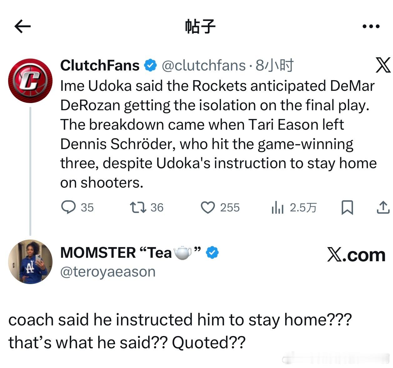 休斯顿火箭休斯顿火箭 ClutchFans:伊梅·乌多卡表示,火箭队赛前就预判到德马尔·德罗赞会在最后一攻选择单打。防守出现纰漏的原因是,塔里·伊森离开了丹尼斯·施罗德——后者投进了制胜三分,而乌多卡此前明明要求球员死守射手、不要轻易离位。伊森妈妈评论道:“教练说他叮嘱过伊森要死守在原地???他真这么说的??有没有引述原话??”