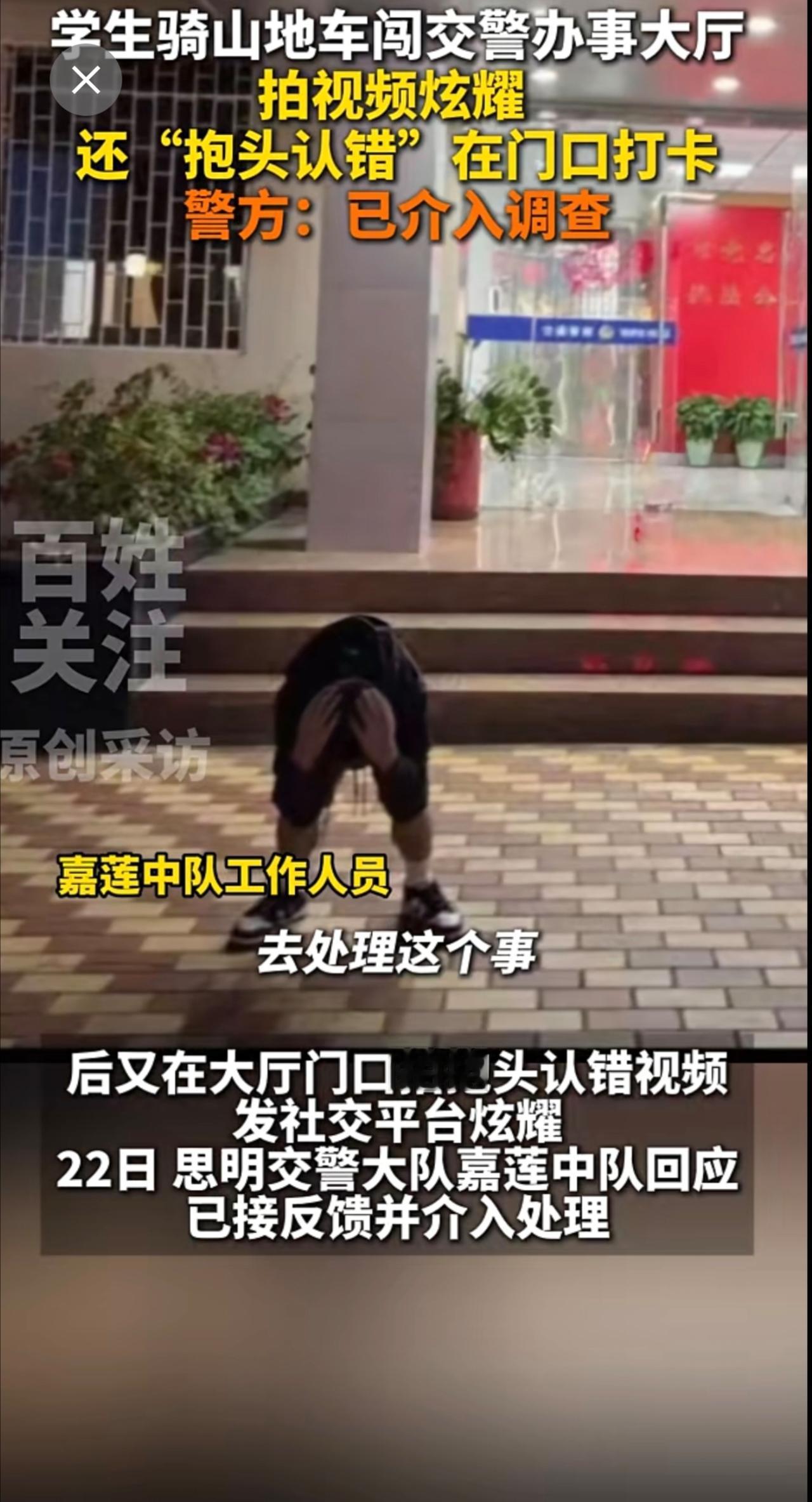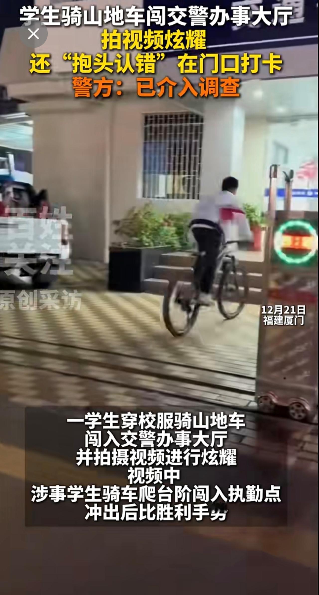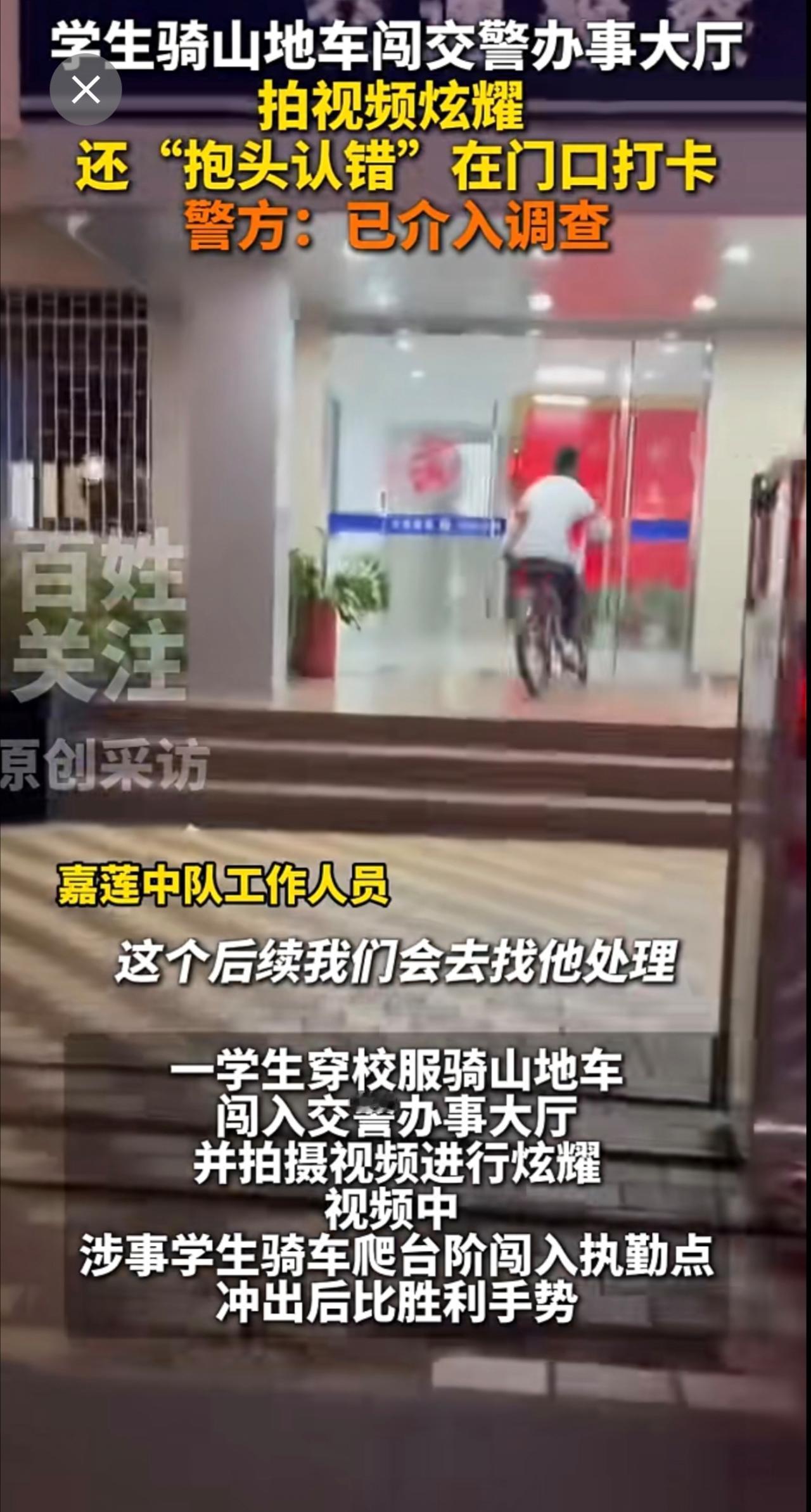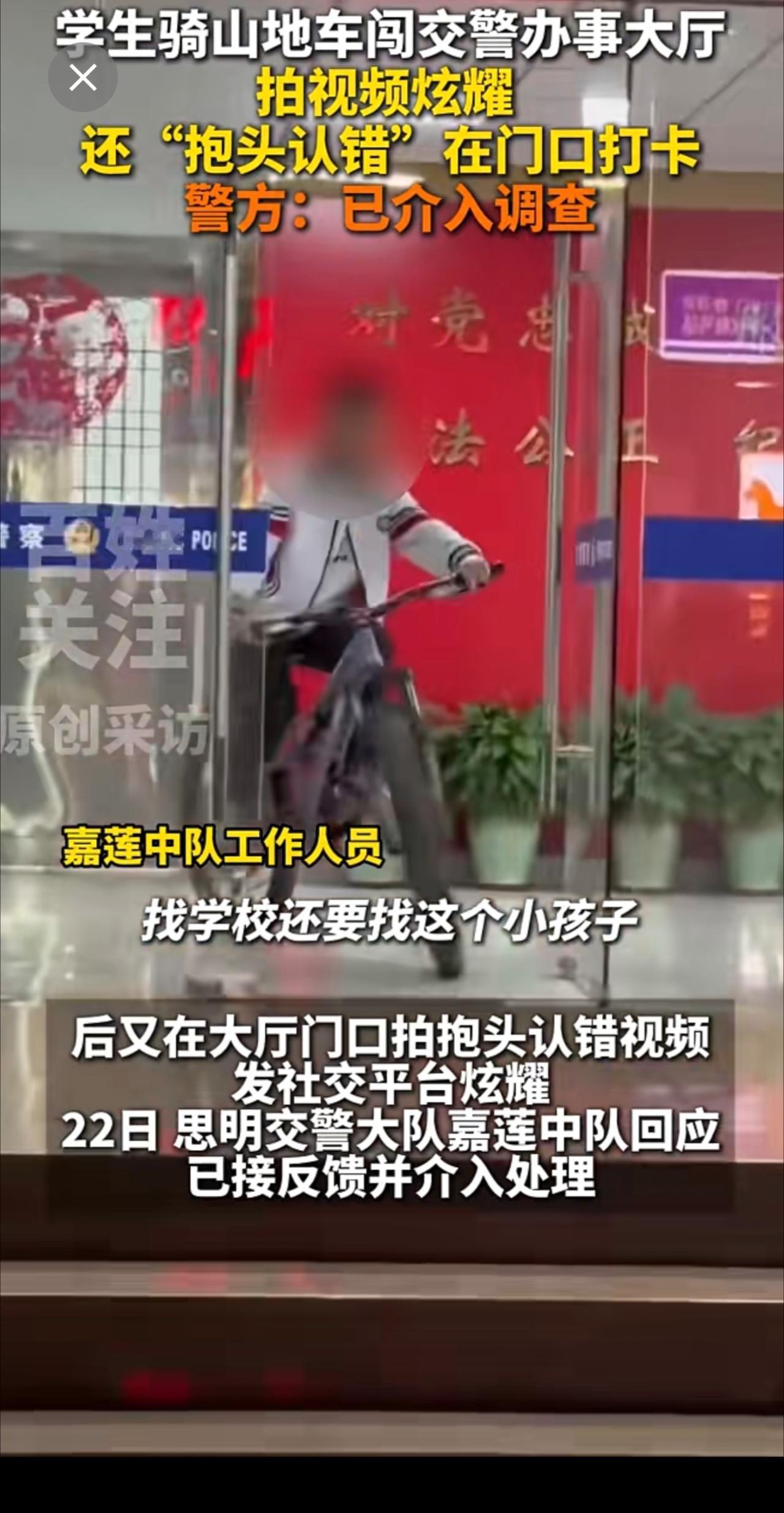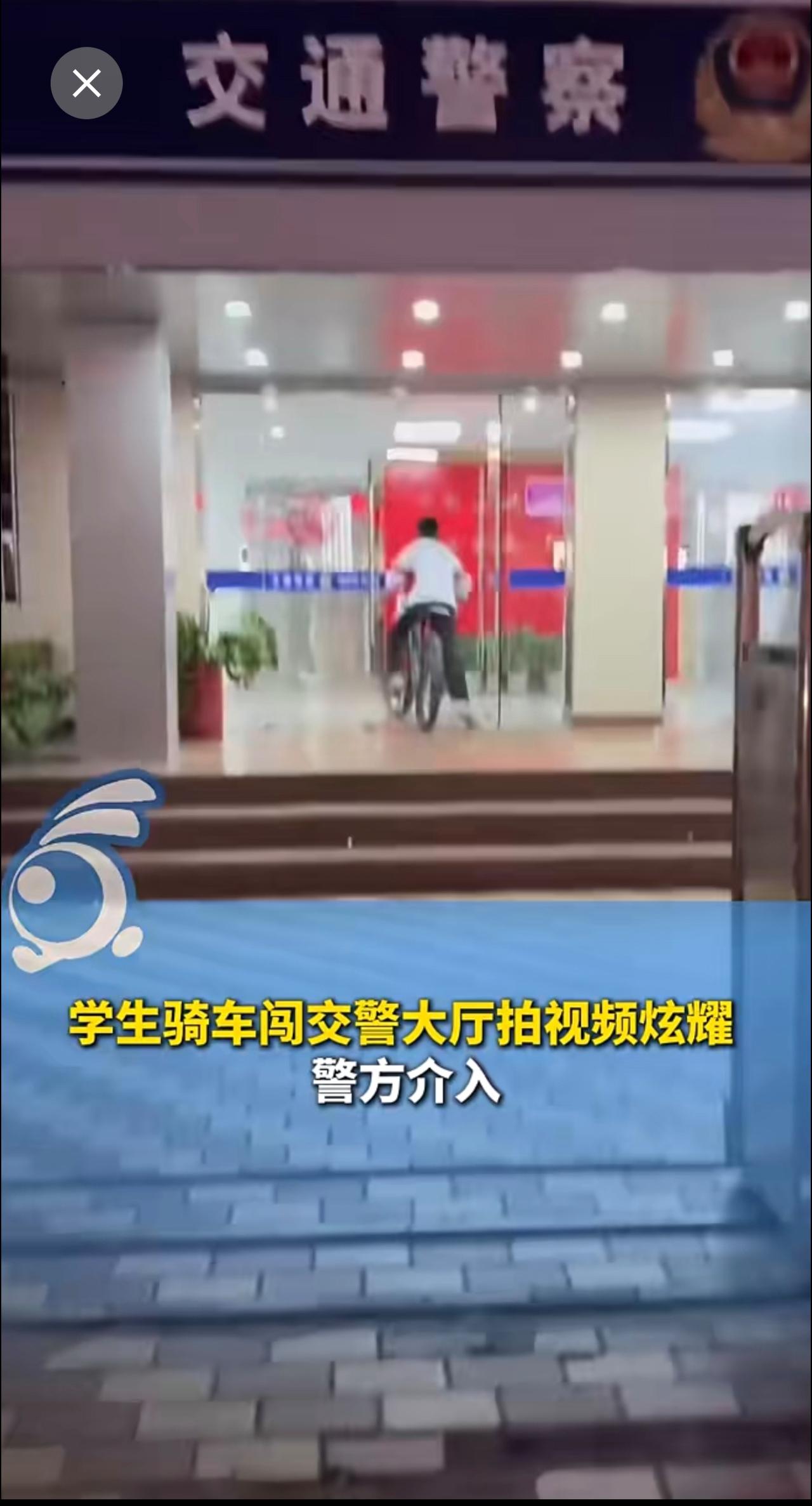 学生骑车闯交警大厅拍视频炫耀 ,警方介入。