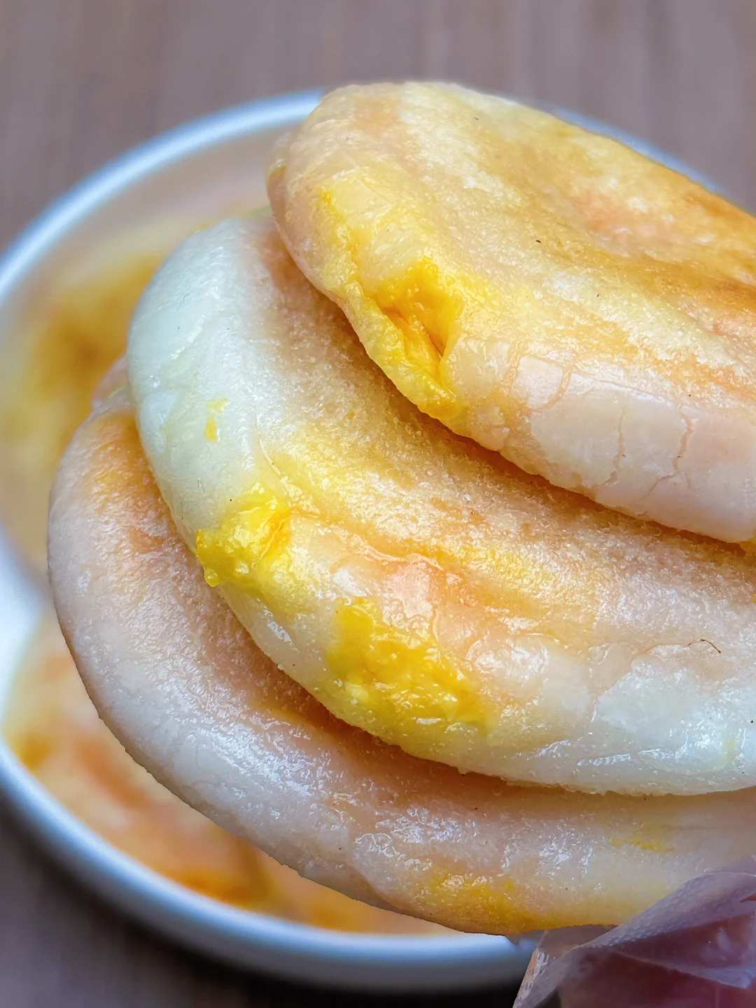 3⃣️每份揉成饼,拍扁后放入红薯泥,虎口收口捏紧搓成圆球,再压扁整理成小饼