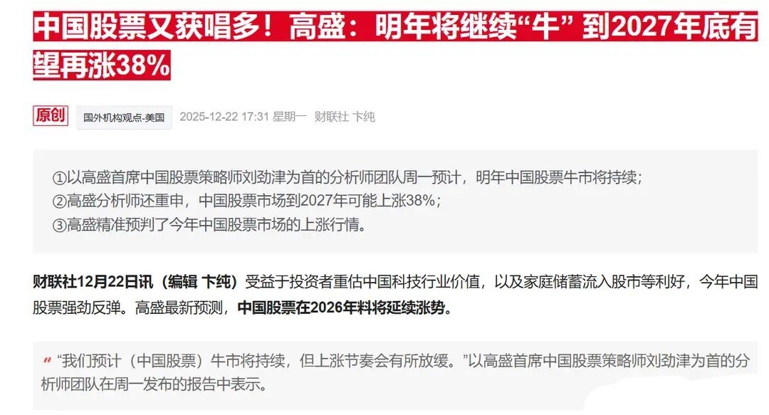 突发!高盛重磅发声:A股2027年底再涨38%!明天短线必须警惕变盘今天A股彻底燃爆了!成交额一举冲破1.8万亿大关,大盘强势站稳3900点,两市涨停潮席卷全场,超百只个股昂首封板!四连阳的凌厉走势,让盘后多头氛围直接拉满——这波行情,是不是看着就要一路狂飙?别急!盘后一条大消息炸翻市场:高盛重磅唱多,直言中国股票明年继续走牛,到2027年底还要再涨38%!要知道,这可不是高盛孤军奋战,大摩、摩根大通、瑞银等国际巨头早就集体看多A股。算下来,未来两年平均每年涨幅至少20%,这收益谁看了不眼红?这份报告简直就是给市场信心注入强心剂!但林哥要提醒大家:高盛话只说了一半!它明确提到——牛市会持续,但上涨节奏会放缓!这话什么意思?说白了,明年A股大概率还是今年的路子:结构性牛市为主,疯牛想都别想!科技、能源金属、周期有色这些主线,依旧是机构抱团的主战场。但行情不会单边大涨,更可能是“涨一波、盘一阵、再上攻”的慢牛节奏,碰到压力位还会挖坑洗盘,熬得住的人才能吃肉!记住林哥的老规矩:人声鼎沸时就是撤退信号!别等指数跌下来,才发现自己竹篮打水一场空!说完长线,重点来了——明天A股怎么走?短线情绪要变天了!今天的行情看着红火,实则暗藏玄机,林哥给大家扒开看核心信号:1. 全天放量千亿,可下午盘面直接熄火,指数明显滞涨,资金追高意愿断崖式下跌;2. 内资主力上演“变脸戏法”,上午还在疯狂净流入,收盘直接转为净流出,最后一小时抛压山大;3. 大盘冲到3920点,离前期高点3936点就差十几个点,资金畏高情绪集体爆发;4. 个股涨跌家数大逆转,上午3500多只上涨,收盘不足3000只,获利盘跑路的脚步根本停不下来!再看30分钟K线图,今天留下3893-3900点的缺口,指数在高位横盘震荡——明天就是关键变盘窗口!林哥判断:指数在3900点上方承压,又临近前期高点,明天小周期震荡回调的概率极大!这对短线股民来说,绝对是利空信号:个股会大面积分化,不少票要开始兑现调整!但对于布局明年的资金来说,这波回调完全不用慌!技术面的回踩确认,恰恰是踏空资金上车的黄金机会!最后给大家划两个明天的关键观察点:1. 盯紧美股科技股!今晚它们要是分化,明天A股科技板块大概率跟着分歧,直接影响市场情绪和指数走势;2. 看券商板块脸色!券商一直横盘震荡,明天要是不能放量突破带节奏,市场信心就会受压制,短线回调板上钉钉!总的来说,明天指数短期回踩是大概率事件,个股情绪会进入衰退期,但衰退不会太久。A股的尿性大家都懂:涨几天、调一两天,马上就有资金抄底进场!林哥就说这么多,明天开盘见真章!