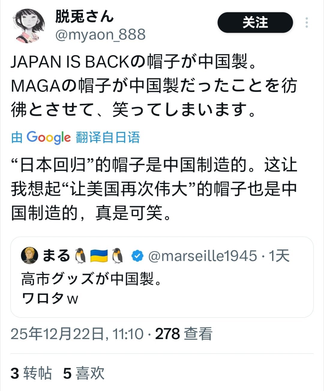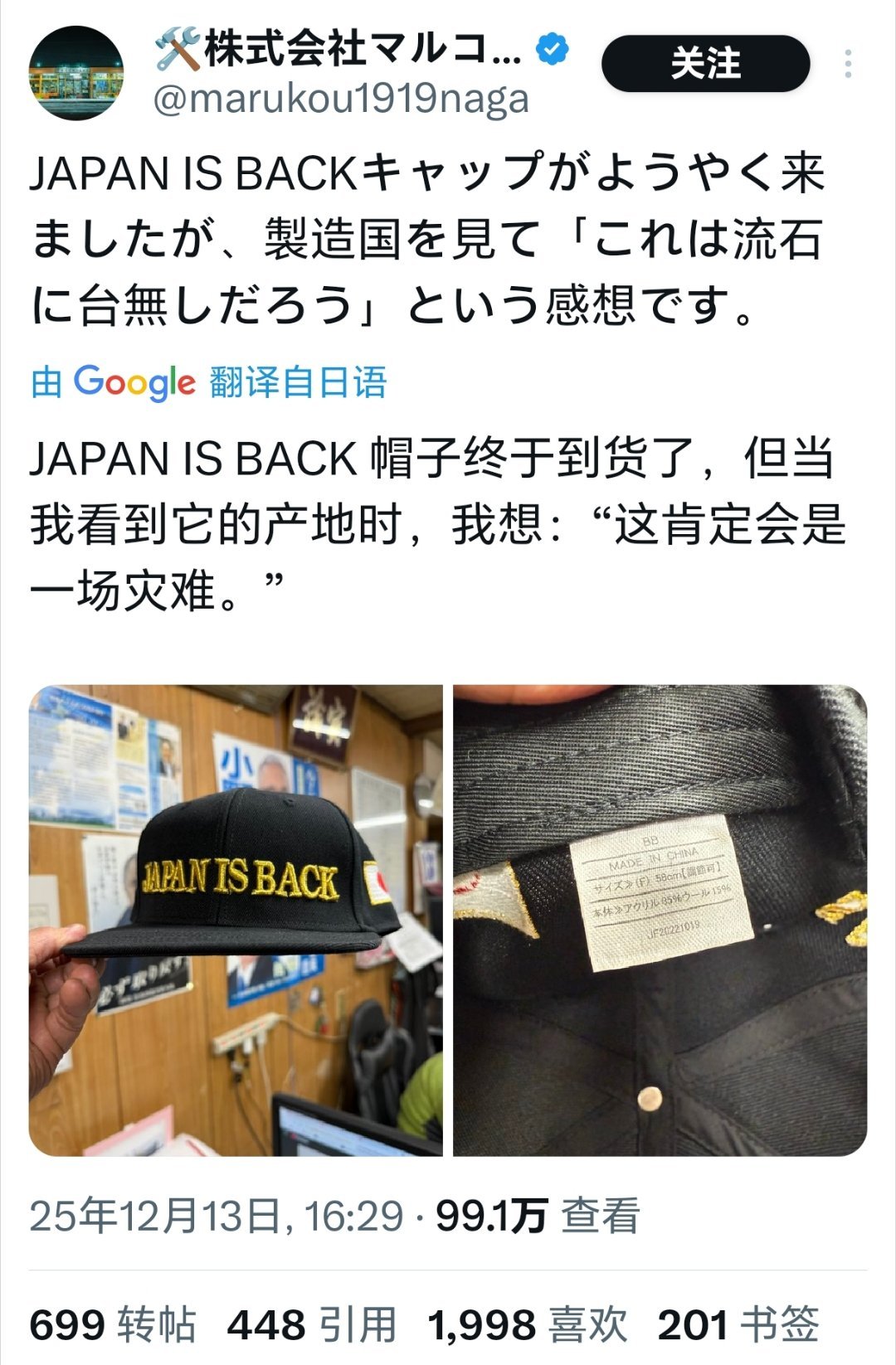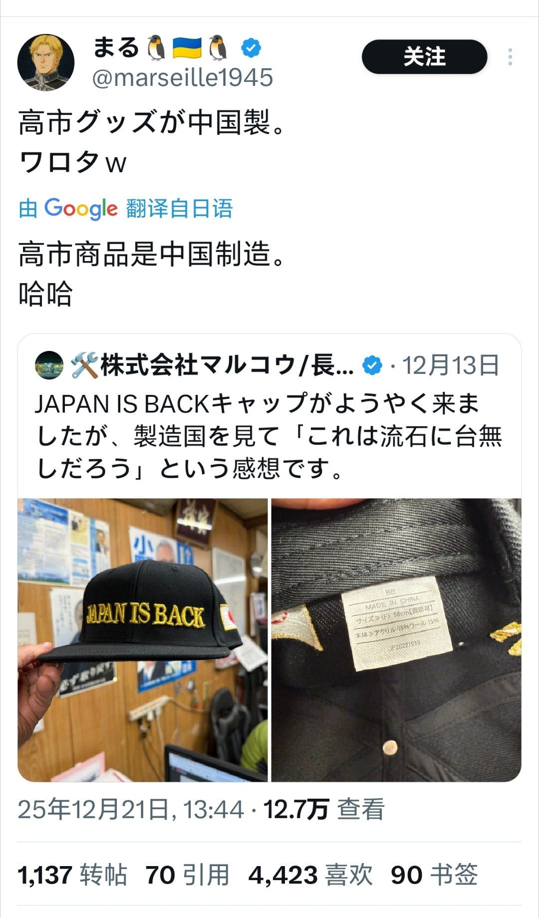 高市早苗模仿特朗普开售应援帽 高市早苗推出的“Japan Is Back”口号“应援帽”已上架商店,该帽子模仿特朗普“MAGA”帽子设计。有日本网友购买后发现该帽子上竟写有“中国制造”标识,引发日本网民群嘲。