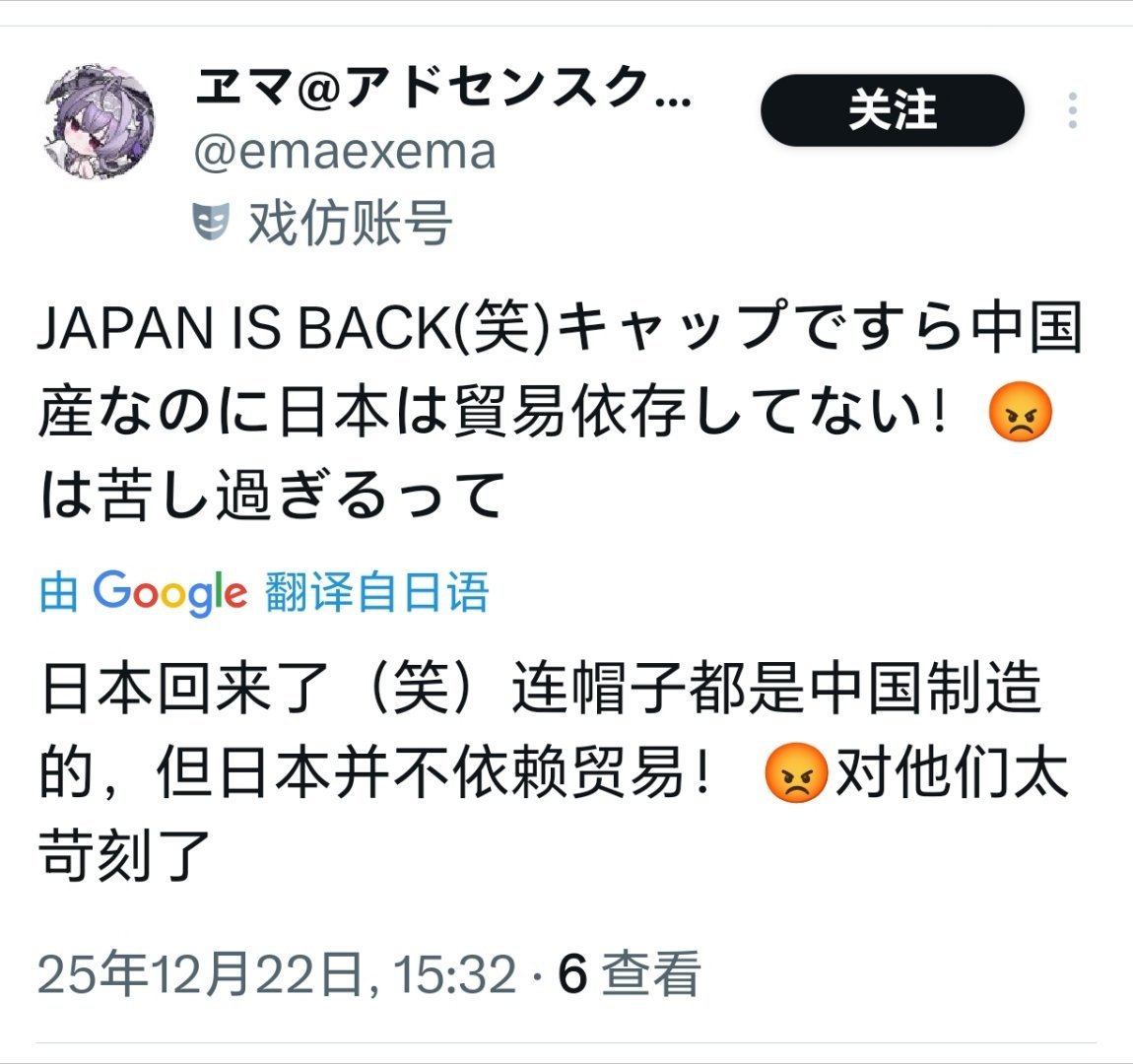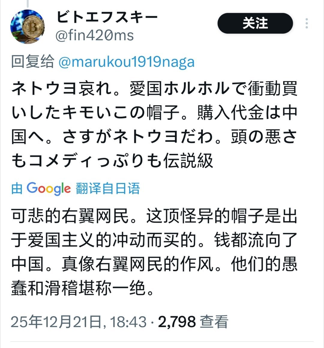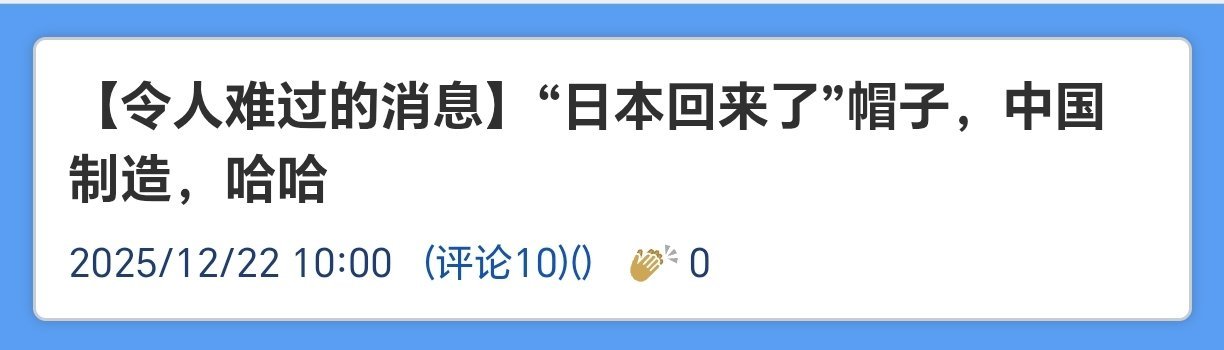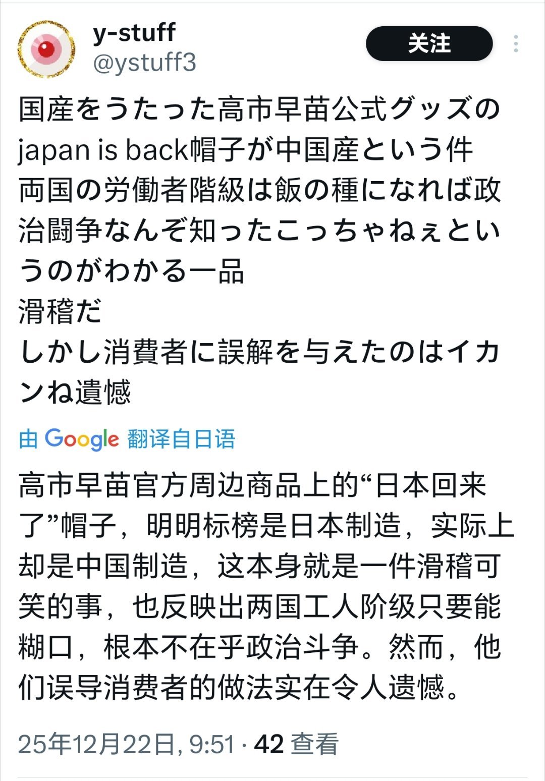 高市早苗模仿特朗普开售应援帽 高市早苗推出的“Japan Is Back”口号“应援帽”已上架商店,该帽子模仿特朗普“MAGA”帽子设计。有日本网友购买后发现该帽子上竟写有“中国制造”标识,引发日本网民群嘲。