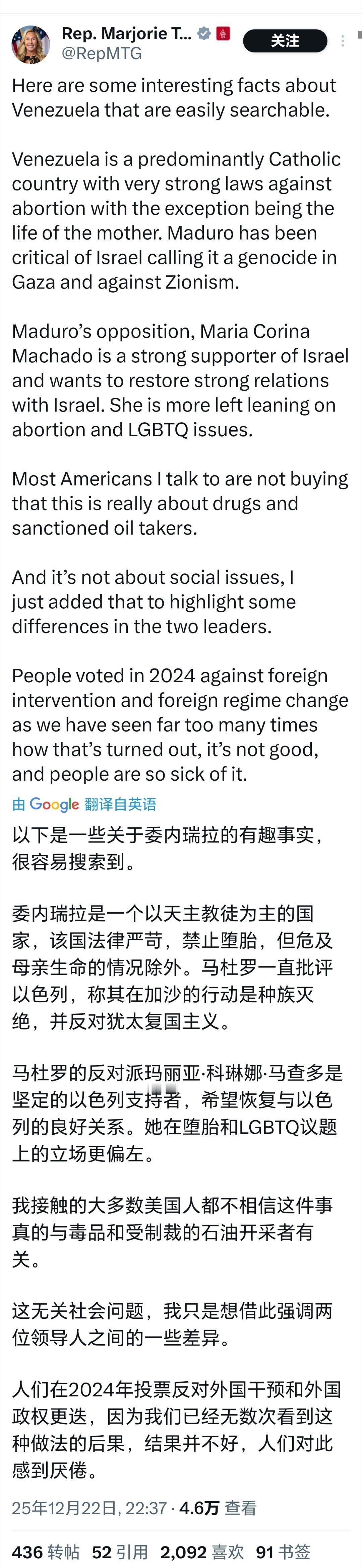 美国共和党议员格林评论马杜罗与马查多格林的评论核心在于揭露并批评美国政府在委内瑞拉问题上的“双重标准”和“虚伪叙事”。她试图通过对比马杜罗和马查多的政策倾向,说明美国对委内瑞拉的干预并非基于民主或人权原则,而是服务于地缘政治和意识形态目标。具体而言,她的观点可总结如下:1. 揭露美国叙事的矛盾格林指出,美国官方常将委内瑞拉问题简化为“民主 vs. 独裁”的对立,但实际两位领导人的政策与美国国内政治价值观存在明显错位:马杜罗在国内推行保守政策(如反堕胎),对外反美、反以色列,批评以色列在加沙的行动是“种族灭绝”。马查多作为反对派领袖,在国内持左翼社会立场(支持堕胎、LGBTQ权利),对外亲美、亲以色列。格林借此质疑:如果美国真的关心“民主价值观”,为何支持一个社会政策上“左翼”的反对派,却打压一个社会政策“保守”的现任政府? 她认为这暴露了美国干预的真实动机——并非出于原则,而是基于地缘政治利益(如控制石油、打击反美政权)。2. 批判美国干预主义的后果格林强调,美国公众已对“外国政权更迭”感到厌倦,因为历史证明这种干预(如伊拉克、阿富汗、利比亚)往往导致混乱和长期负面后果。她暗示,美国在委内瑞拉问题上的行动并非为了委内瑞拉人民的利益,而是为了服务美国的政治经济议程(如能源安全、遏制反美势力)。3. 暗示美国舆论被操纵格林提到“大多数美国人不相信选举与毒品/石油有关”,意在指出美国主流叙事掩盖了干预的真实目的(如遏制委内瑞拉石油出口、打击毒品贸易等实际利益),反而将问题包装成“推动民主”。她认为公众需要看清这种叙事背后的双重标准。核心意图:格林通过对比马杜罗与马查多的差异,试图说明:美国的外交政策充满意识形态和利益驱动的选择性:对“敌国”批判其人权问题,但对盟友的类似问题视而不见;对“反美政权”打压,对“亲美势力”扶持,无论其国内政策是否与美价值观一致。呼吁美国停止干预他国内政:她代表了一部分美国民众的孤立主义倾向,反对以“推广民主”为名行格林本质上是在拆穿美国对委内瑞拉政策的虚伪性,并借此抨击美国外交政策中的双重标准。她暗示,美国支持马查多并非因为她更“民主”,而是因为她更亲美亲以色列;而打压马杜罗也并非因为他“不民主”,而是因为他反美反以色列。这一观点旨在唤起公众对美国长期干预主义后果的反思,并推动外交政策向“美国优先”方向转变。
