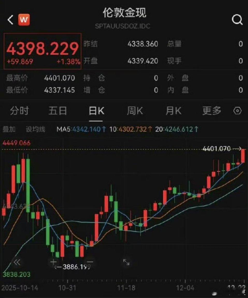 国际黄金期价破每盎司4400美元突破4400美元关口!国际金价,再创新高美国纽约商品交易所黄金期货价格21日再创历史新高。其中,交投最活跃的2026年2月黄金期价盘中突破每盎司4430美元伦敦现货黄金价格当地时间22日突破每盎司4400美元关口,同创历史新高。彭博社文章分析认为,地缘政治紧张局势加剧、市场预期美联储进一步降息是黄金价格飙升的主要原因。各国央行持续购买黄金以及黄金交易所交易基金(ETF)的资金流入也推高了黄金价格。彭博社汇总的数据显示,黄金支持的ETF已连续五周出现资金流入。世界黄金协会的数据显示,除今年5月外,这些基金的总持仓量今年每个月都在增长。