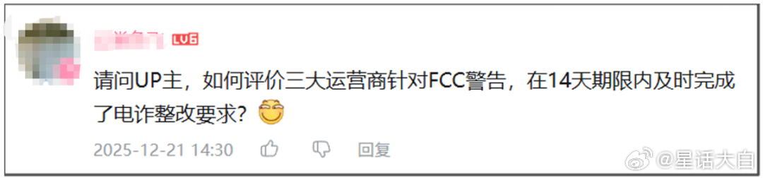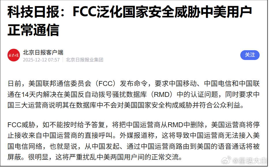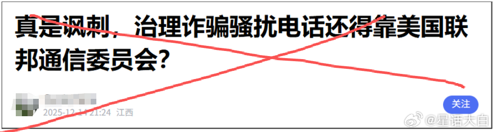 最近有大量营销号造谣称:“美国FCC向中国三大运营商发出最后通牒,整治来自中国的骚扰电话,否则就禁止三大运营商在美国的一切业务。”然后这个消息就被各路水军进一步谣传称“治理骚扰电话还得靠美国”。比如,有人在我文章底下留言,问我“如何评价三大运营商针对FCC警告,在14天期限内及时完成了电诈整改要求?”还贴一个坏笑的表情,这显然并不是诚心求问,而是带着节奏来找茬。不过,既然有人问,我就去做进一步查证,这件事情到底是怎么一回事。首先需要防杠叠个甲,我这里只对这件事情做事实核查。当前骚扰电话仍然比较严重,我个人也感到不满,做这个事实核查,不代表我认为当前骚扰电话不严重。只是一码事归一码事,美国并没有帮我们打击骚扰电话。还是需要基于实事求是精神去做事实核查。网络上营销号谣传的消息,往往是根据一些公开信息去各种歪曲和添油加醋。这则谣言的真正信息源是:“12月8日,美国联邦通信委员会(FCC)发布命令,要求中国移动、中国电信和中国联通在14天内解决在美国反自动拨号骚扰数据库(RMD)中的认证问题,同时要求中国三大运营商说明其在数据库中不会对美国国家安全构成威胁并符合公众利益。”其实这段信源里,已经说了“FCC威胁,如不能按时给予答复,将把中国运营商从RMD中删除”。这说明,三大运营商原本已经在美国的RMD反骚扰数据库里。只是美国泛化国家安全威胁,要求中国运营商提供证据证明其出现在RMD反骚扰数据库里,不会对美国安全造成威胁,否则就将三大运营商从RMD反骚扰数据库里删除。也就是,美国FCC并不是因为三大运营商没有阻止打往美国的骚扰电话,才被FCC威胁。而是美国FCC认为三大运营商出现在美国的RMD反骚扰数据库里,会威胁美国国家安全,才要威胁把三大运营商踢出。