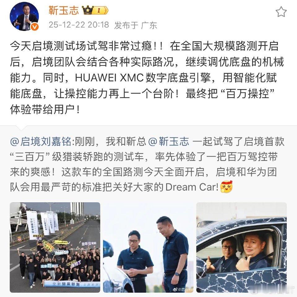 华为系首款猎装轿跑曝光启境汽车,已于今日全面开启全国路测。消息称,测试车辆将奔赴全国超过20座城市,在真实的复杂路况,以及极寒、高温和高海拔等极端环境下,开展全面工程验证,后续将结合各种实际路况,调优底盘的机械能力。另据此前报道,启境汽车还将深度考虑华为乾崑智驾ADS 高速L3*有条件自动驾驶技术架构。百万颜值、百万驾控、百万智能,作为华为系首款猎装轿跑,我已经可以预想到,明年6月上市后,启境汽车将面临怎样的盛况了!三百万启境开启路测
