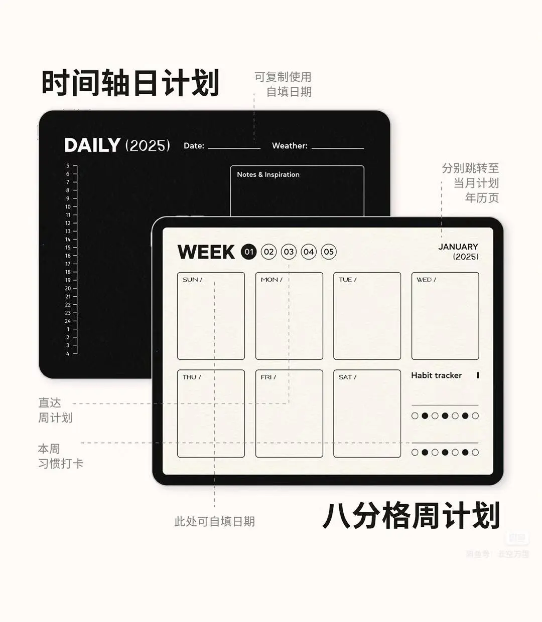 🌈模板 丨极简电子手帐 🌈配色丨 白色/黑色版本 🌈 2025全年日历丨均可超链接跳转 🌈 12月计划丨周计划丨日计划丨互相超链接跳转 🌈 月计划丨日历格及打卡 🌈 周计划丨八分格 🌈 Notability/Goodnotes/千本/云记等可以打开pdf格式的软件均可使用 电子手帐模板 手账模板 计划本 goodnotes notebility 电子笔记模板 无纸化学习 我的文具分享 手帐