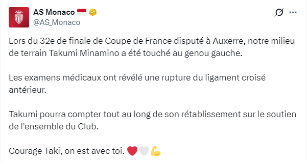 利物浦旧将 摩纳哥官方公告:在欧塞尔举行的法国杯三十二分之一决赛中,南野拓実左腿膝盖受伤。医疗检查结果显示,其左膝前交叉韧带断裂。在整个康复期间,南野拓実都将得到球队的全力支持