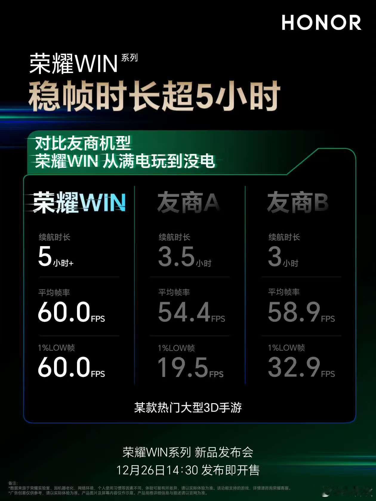 荣耀win是真的稳,稳帧超5小时,0卡顿,0抖动,0拖影,外加10000mAh大电池妥妥的上分神器。荣耀WIN率先实装10000大电池荣耀WIN系列续航10000夯到顶