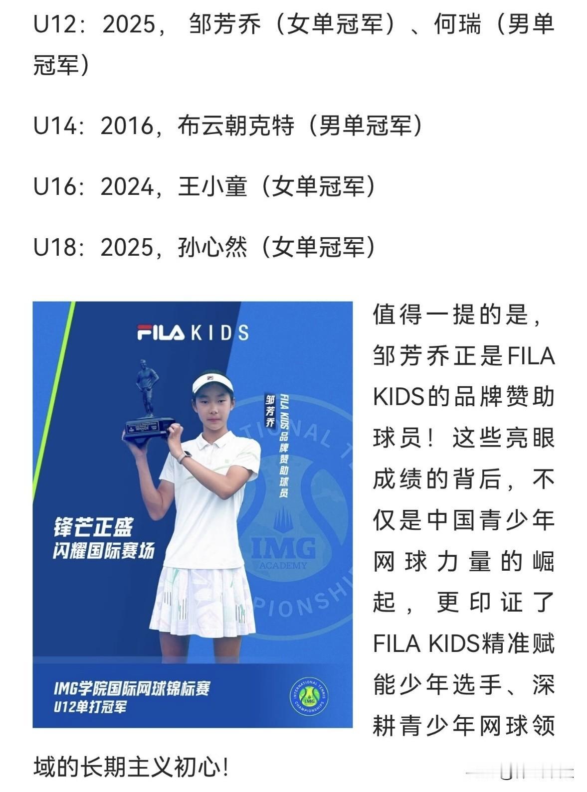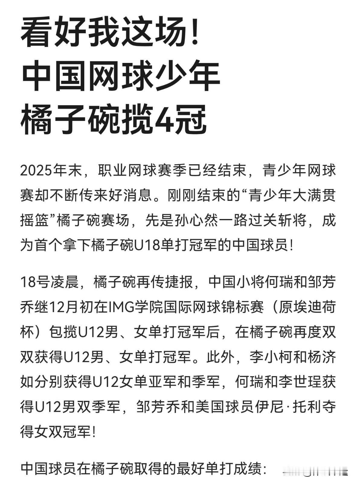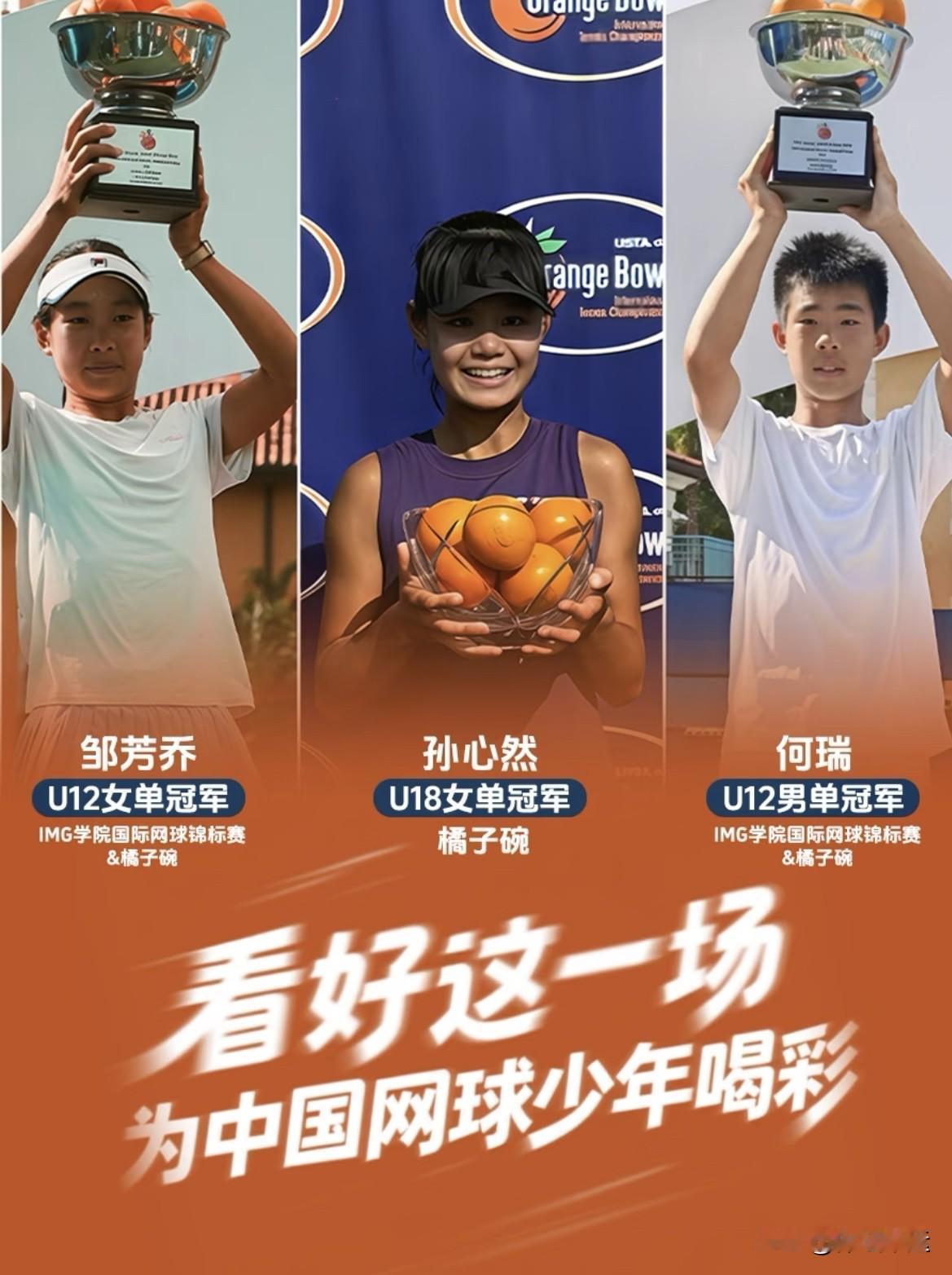 中国少年网球选手在橘子碗实现了历史性突破,太让人激动了! 15岁的孙心然在橘子碗U18女单决赛零输盘夺冠,成为首个获此赛事冠军的中国选手,填补了冠军空白。她一路过关斩将,决赛复仇曾两次击败自己的对手,世界青少年排名升至第14位,还拿到明年澳网青少年组种子名额。 此外,何瑞和邹芳乔分别获12岁组男、女单打冠军。此前在“IMG杯”,他们同样夺冠,还有多对组合和选手取得好成绩。期待这些小将未来继续闪耀网坛!
