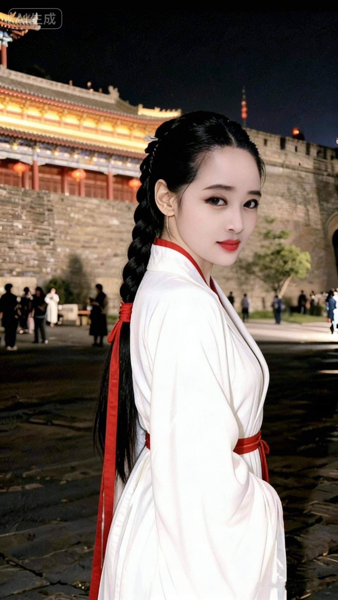 黑夜城墙下,美女身着白色传统服饰,姿态宁静优雅。光影柔和,勾勒出她清丽的轮廓,古典气质在静谧夜色中缓缓流淌。
