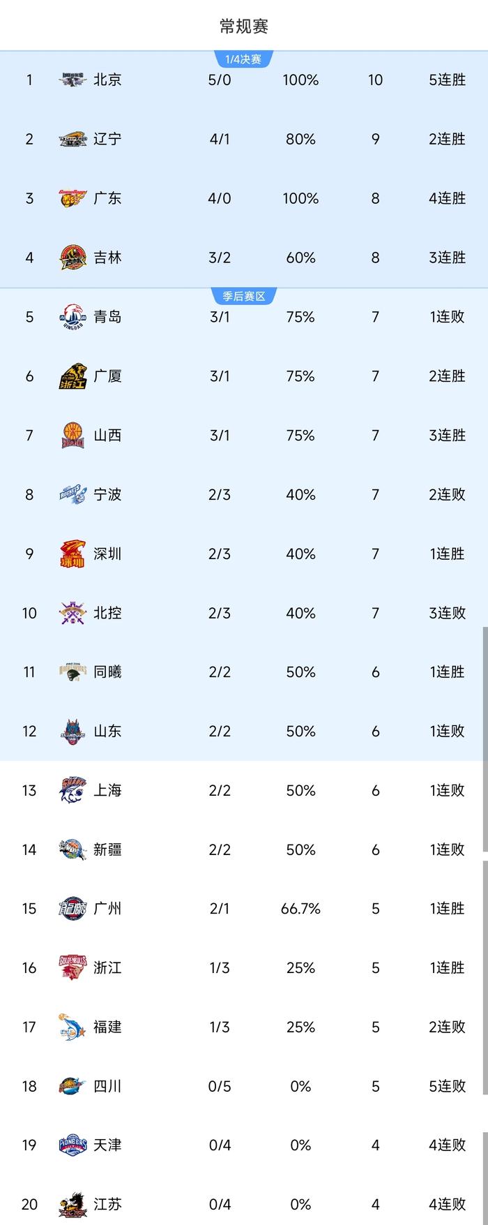 CBA精彩夜!前总冠军51分惨败,最新排名乱了:2队全胜+3队全败 北京时间12月22日晚上,CBA常规赛第5轮全部结束,上演悲喜一夜,北京队客场51分优势大胜四川队,辽宁队主场12分优势大胜北控队,超越广东队升至第二,深圳队客场绝杀山东队,吉林队主场逆转战胜宁波队。北京队VS四川队的对决,前者全胜领跑,后者全败垫底,可见双方的差距非常大。本场比赛,赵睿、周琦领衔北京队首发阵容,四川队尽管签下外援,但本场比赛还是全华班的阵容出战,结果第一节便被北京队拉开分差,比分10-29大幅度落后,到第二节仅仅得到6分,上半场结束时16-52落后北京队36分。   据统计,四川队半场仅仅得到16分,也成为了CBA历史上半场得分最低的球队。   到了下半场,北京队开始轮换阵容,主力队员早早下场休息,周琦更是仅打七分钟,但比分继续拉开,最终97-46狂胜,送四川队51分的惨败。   球员数据统计,北京队四人的得分上双,包括斯佩尔曼17分5板1助、杰曼12分2板3助、马帝昂10分10板2帽、方硕10分2板5助。   取胜之后,北京队收获开局5连胜,也是新赛季以来首支做到的球队,继续领跑积分榜,如果本轮广东队输球的话,那么北京队将是唯一一支开局保持全胜的球队。