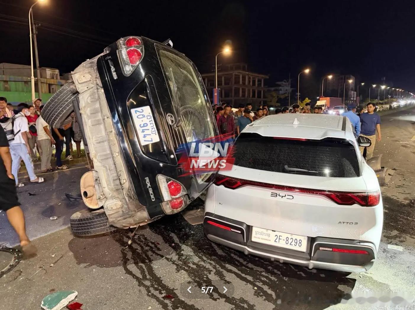 柬埔寨金边发生一起事故 有消息称 是雷克萨斯车速过快驶入对向车道结果发生不测从图上看 这辆雷克萨斯和比亚迪也算故人了没想到多年后异国他乡 竟然以此种方式碰面。
