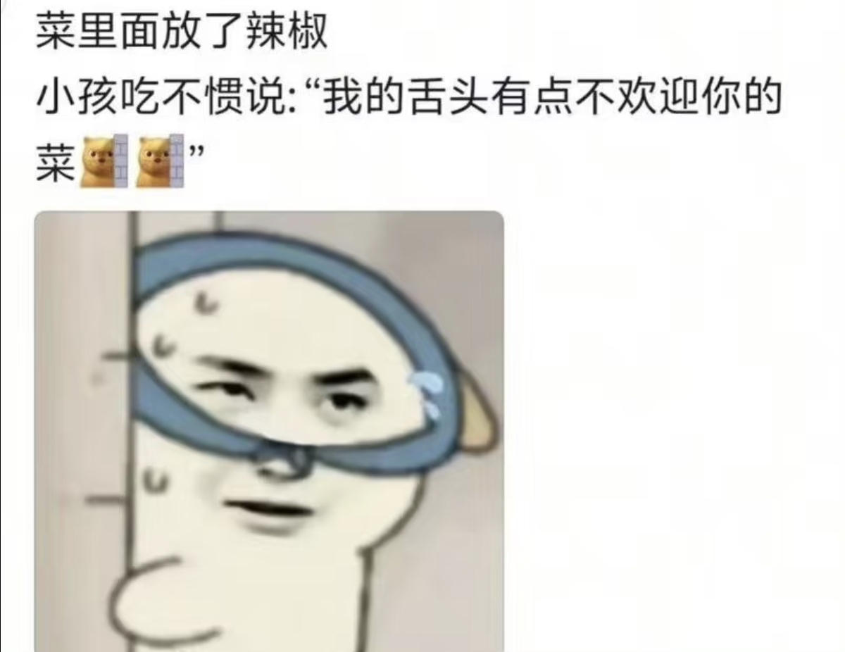 菜里面放了辣椒,小孩吃不惯说:我的舌头有点不欢迎你的菜