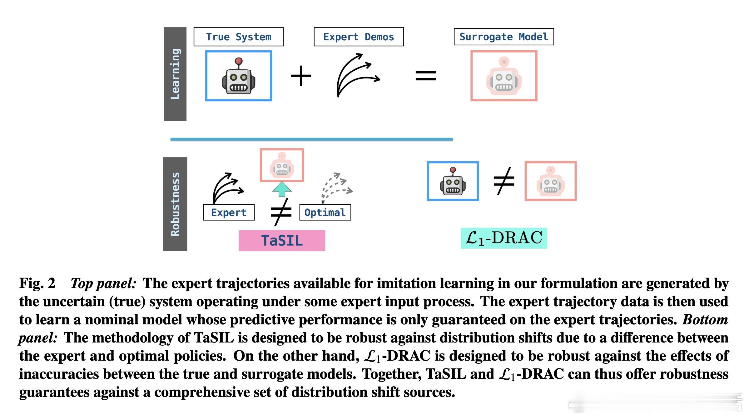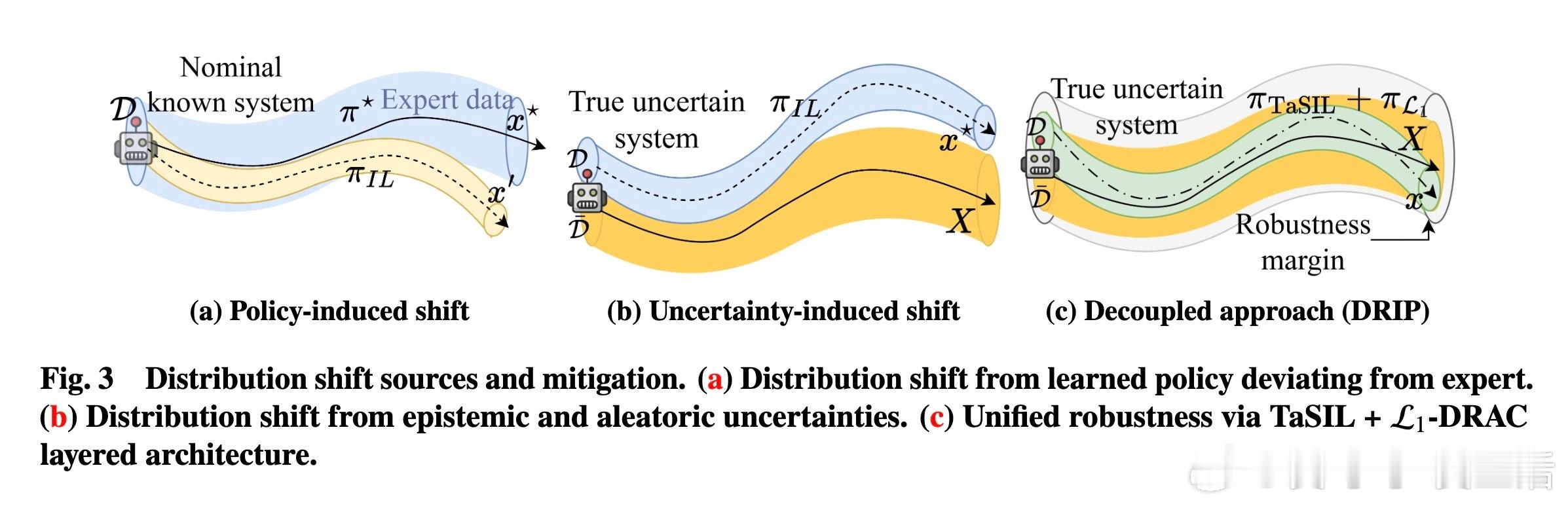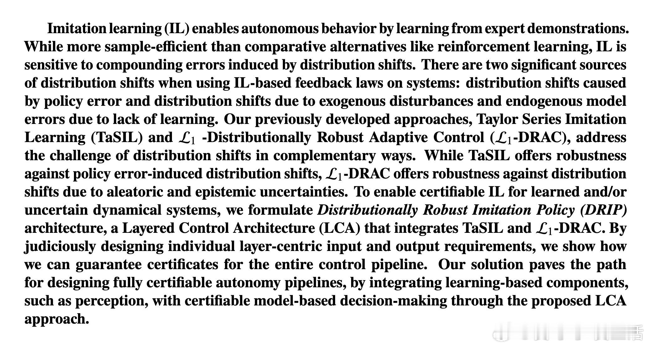 [LG]《Distributionally Robust Imitation Learning: Layered Control Architecture for Certifiable Autonomy》A Gahlawat, A Aboudonia, S Banik, N Hovakimyan... [University of Illinois Urbana-Champaign & University of Pennsylvania] (2025) 模仿学习(Imitation Learning)虽然高效,但在面对现实世界的复杂性时,往往显得脆弱。UIUC与加州理工、麻省理工等机构合作的最新论文提出了一种名为DRIP的分层控制架构,旨在解决自动驾驶和机器人领域最核心的痛点:分布偏移。这不仅仅是一个算法的改进,更是一次关于可验证自主系统(Certifiable Autonomy)的深度思考。1. 模仿学习的阿喀琉斯之踵模仿学习的核心在于复刻专家的行为。然而,在实际部署中,系统总是会不可避免地偏离专家轨迹。这种微小的偏离会随时间累积,形成模仿间隙(Imitation Gap)。分布偏移主要源于两个维度:一是策略误差,即学习者没能百分之百精准地掌握专家的意图;二是环境的不确定性,包括外部干扰、模型建模不精细以及传感器的随机噪声。2. 协同进化的双层架构:DRIP研究团队提出的DRIP架构,其核心逻辑在于解耦。它将复杂的鲁棒性问题拆解为两个相互配合的图层:中层控制器采用TaSIL(泰勒级数模仿学习)。它的任务是处理策略诱导的偏移。通过在学习目标中引入高阶灵敏度信息,TaSIL能让系统在偏离专家路线时,具备自我纠偏的意识。底层控制器则由L1-DRAC(L1分布鲁棒自适应控制)坐镇。它像是一个坚实的盾牌,专门抵御环境中的随机不确定性和系统建模误差。3. 整体大于部分之和DRIP最精妙之处在于,它证明了鲁棒性是可以叠加的。TaSIL保证了即使策略不完美,系统也能在名义模型下保持稳定;而L1-DRAC则确保了无论现实世界与名义模型之间存在多大的鸿沟,系统都能强行回归到名义行为上。这种分层设计实现了一种确定性:我们不需要一个全知全能的模型,只需要一个能感知边界并实时修正的机制。4. 迈向可验证的自主性传统的深度学习往往是黑盒,难以在安全关键型系统中获得认证。DRIP通过控制理论的严谨性,为整个控制管线提供了可证明的性能边界。这意味着,我们可以在保留感知层(如视觉识别)的高性能的同时,通过这套分层架构,为决策和执行层打上可验证的补丁。5. 深度思考与启发真正的鲁棒性,不是追求永不犯错,而是在犯错的瞬间就拥有重回正轨的能力。DRIP的成功告诉我们,解决复杂系统问题的最优解往往不是构建一个更庞大的单一模型,而是通过合理的架构设计,让不同的组件各司其职。解耦不是为了分离,而是为了更高级别的融合。这种训练一次、终身自适应的模式,摆脱了对昂贵模拟器和持续专家反馈的依赖,为可认证的自主系统铺平了道路。原文链接:arxiv.org/abs/2512.17899