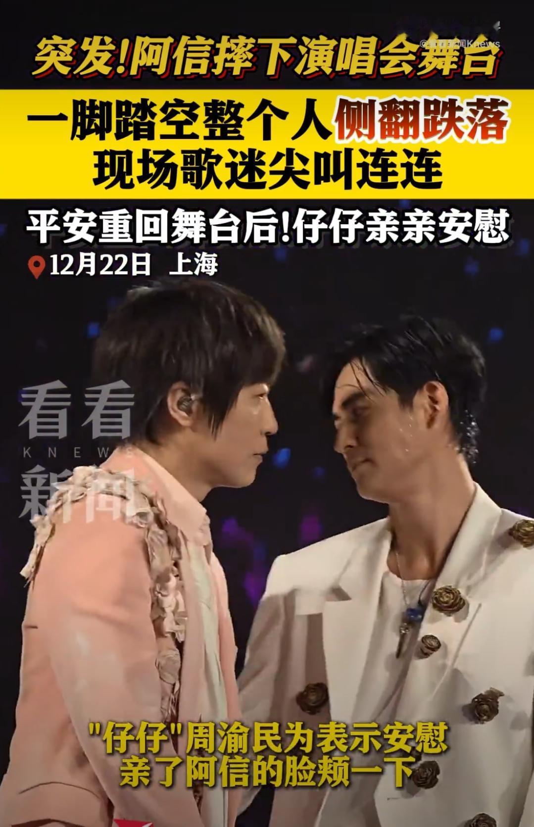 12月22日,上海站演唱会上,F4合体再唱,阿信也来助阵,现场直接梦回青春。结果唱着唱着,阿信一个没站稳,不慎摔下舞台。那一瞬间全场都安静了——不是夸张,真的像心跳被按了暂停键。随后工作人员紧急处理,希望他只是虚惊一场。提醒一句:舞台再嗨也要注意安全,别让“热血”变成“热搜”。阿信摔下舞台