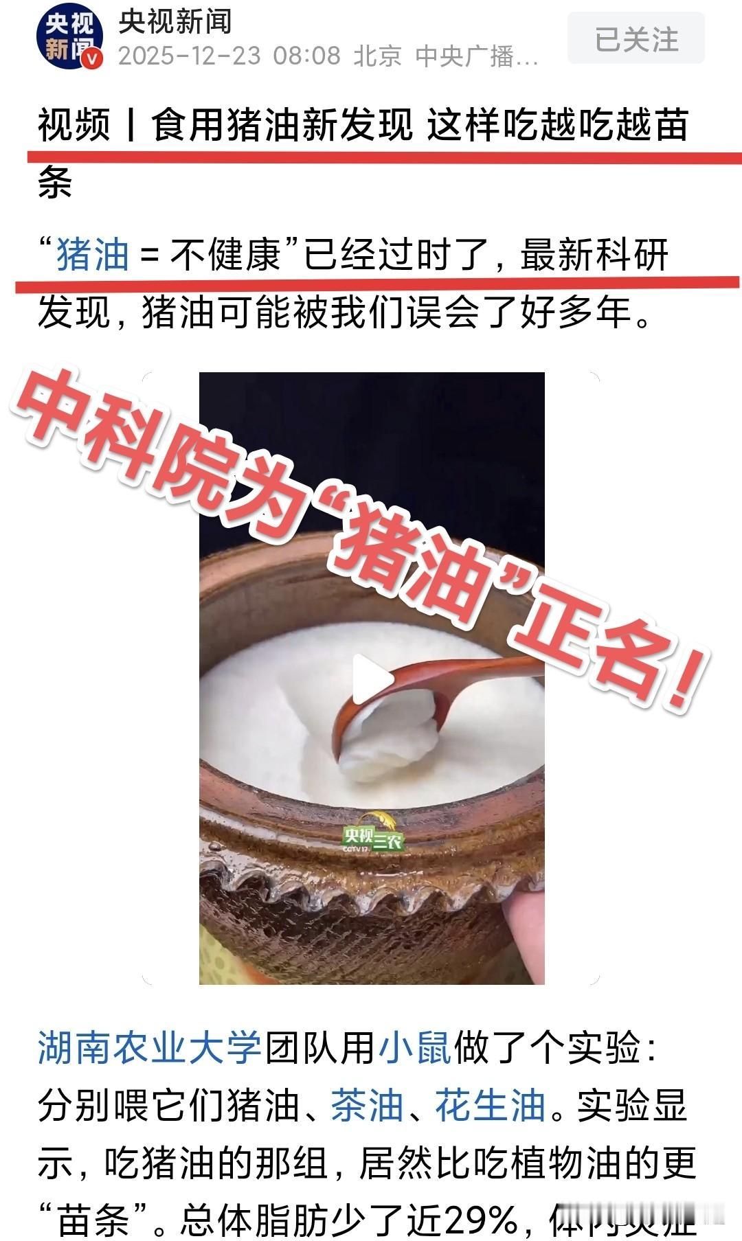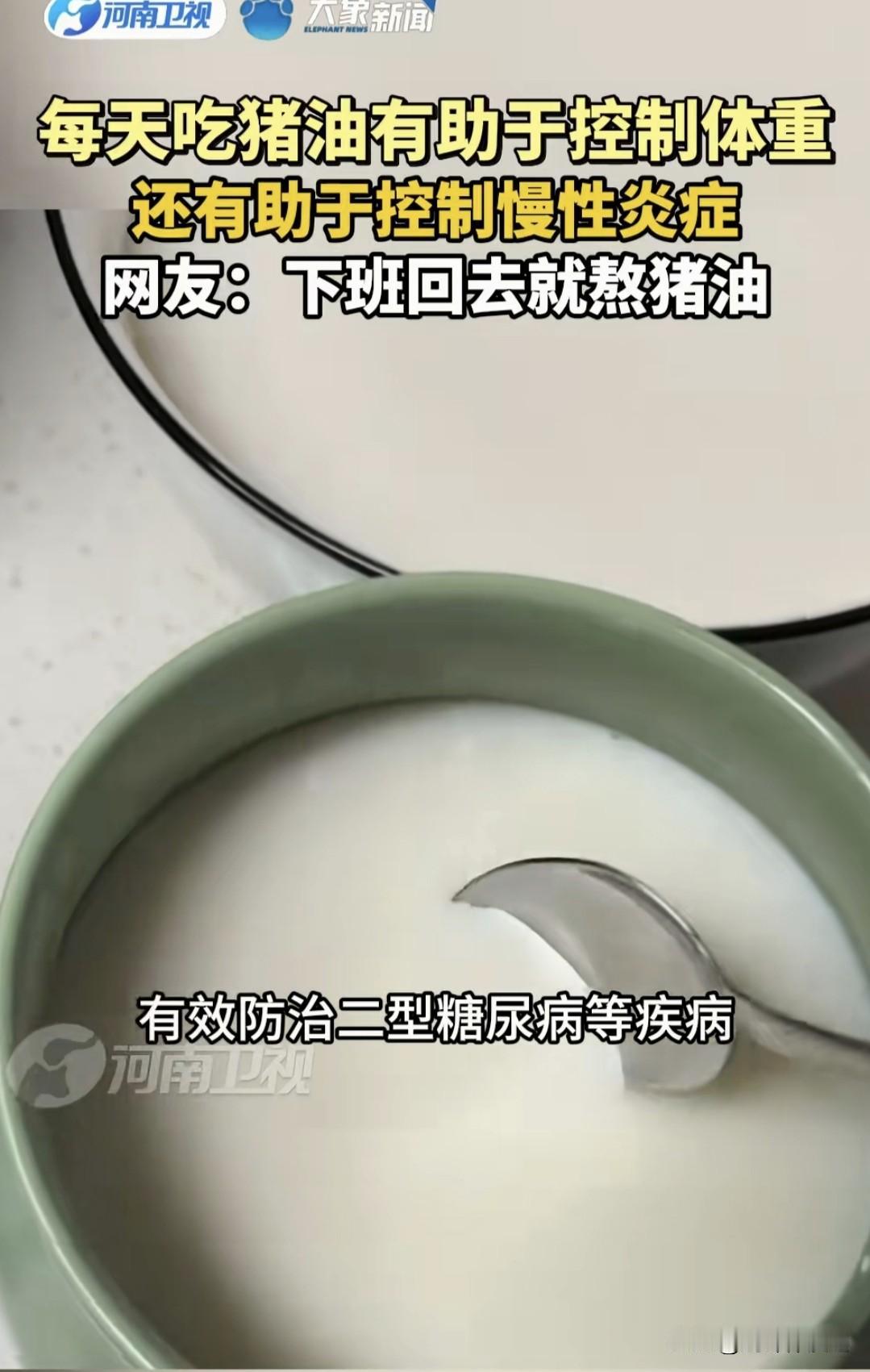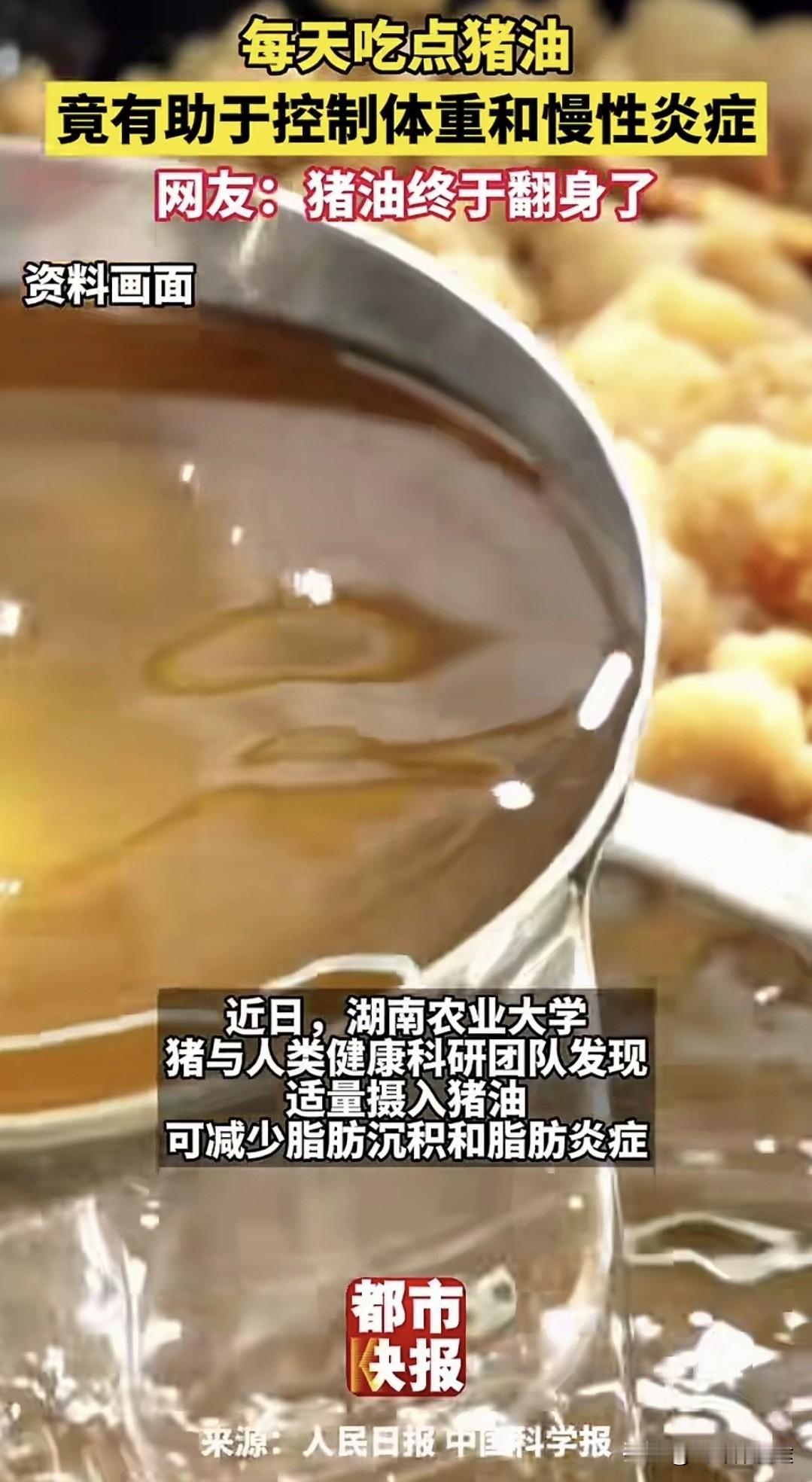 中科院为“猪油”平反,喊话适当吃“猪油”,有利身体去脂肪,降低身体炎症!这表明“猪油”是健康的食用油,不再是“三高”的罪源! 经中科院发布如此之科研结果之后,全国各大媒体平台一时间将“猪油”端上桌了,这是健康食品,不要担心,有利身体健康! 回想 2000 年以前,中国民众的食用“猪油”就是舌尖上的美食,特别是在我们小的时候,除了猪油之外,基本上就有少量的“山茶油”或油菜籽油作为少量的替代油,而猪油必是餐桌的重点食用油。 在七八十年代的时候,猪油更是家家户户离不开的“黄金用油”,一口猪油拦饭,猪油炒菜,远离三四里地都能闻出香味,小时候中午放学路过家门口,挨家挨户都飘出猪油香,真是人间美味。相信当下 80 后 70 后 60 后,猪油就是从小的“味蕾记忆”! 而更是在那个年代,就咱们村里,根本就没有听说过有癌症病人,更不懂什么叫癌症,然而现在动不动就是癌症现状,这不得不让人回味七八十年代的健康生活方式,而猪油就是“永恒的记忆”! 时间来到了 2000 年以后,猪油已经在餐桌上看不到了,也闻不到了,更是被炒作为“猪油有害”,是心血管的根源,一时间“猪油”从餐桌上消失了,而呈现在餐桌上的就是一桶一桶的调和油 ,色拉油 ,大豆油,一直到近年来的转基因 非转基因等等。 虽然说人的健康可能跟许多因素有关,但如今猪油经过中科院的研究为健康有益有油品,更是劝诫大家可以放心多食用猪油,可以降低身体的炎症,也有利于消减人体的脂肪,降低“三高”! 所以专家也建议,可以将植物油与猪油搭配食用,效果更佳! 为此,猪油可以名正言顺的端上餐桌了,放心用吧,小时的候味蕾记忆又回来了!