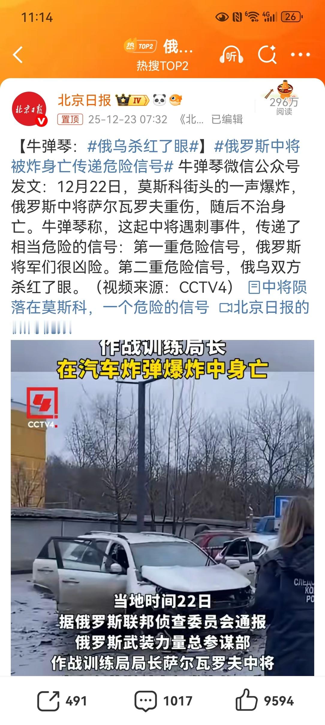 俄乌杀红了眼【俄罗斯中将被炸身亡传递危险信号】从近期“乌克兰战报”公布的俄军伤亡人数变化看,俄乌战争的烈度并没有明显升级,基本上还是俄军小规模的渗透。俄罗斯武装力量总参谋部作战训练局局长法尼尔·萨尔瓦罗夫中将昨天在莫斯科被炸身亡,成为第三个在莫斯科被炸身亡的俄军中将,并不能说明“俄乌杀红了眼”。全网热点共创计划烽火问鼎计划不过,泽连斯基最新表示,在未来几天里,俄可能会对乌克兰发动一次大规模打击。他说:“我们明白,正是在这几天里,他们很可能会这么做—这符合他们的行事风格。正如你们所知道的,他们往往会在圣诞节前后,尤其是在我们庆祝圣诞节的时候,发动某种大规模的打击。所以人们在这几天一定要格外警惕,因为这些家伙可能会发起相应的袭击。对他们来说,没有什么是神圣不可侵犯的。”